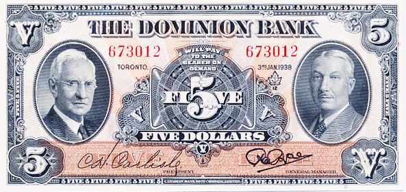 THE DOMINION BANK. $5.00. Jan. 3, 1938. CH-220-28-02. No. 673012. Signed Carlisle-Rae. BCS graded Almost Unc-55.