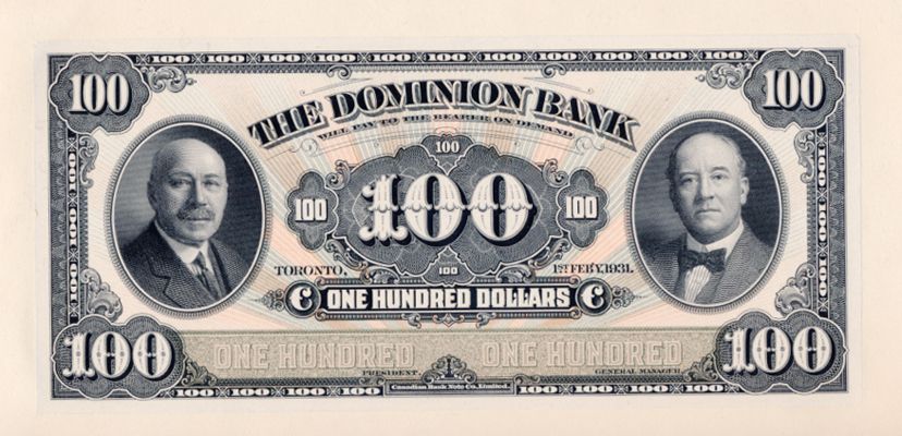$100.00. Feb. 1, 1931. CH-220-24-14P. Full colour Face and Back Proofs. The Face on a small approval card and the Back on a large approval card. Two choice Proofs.