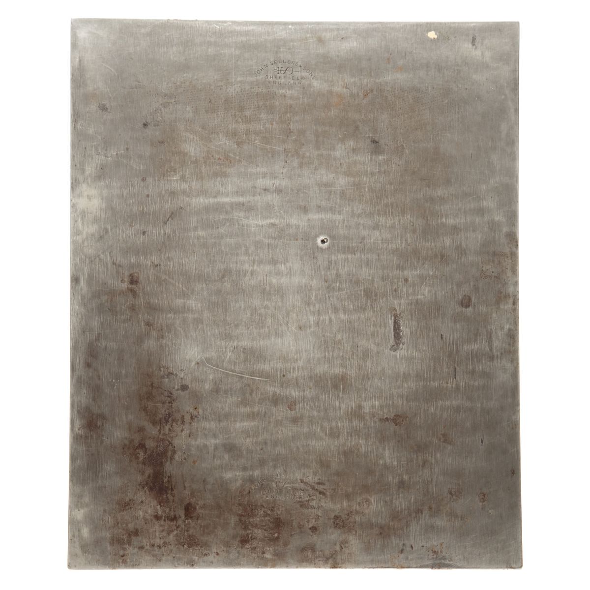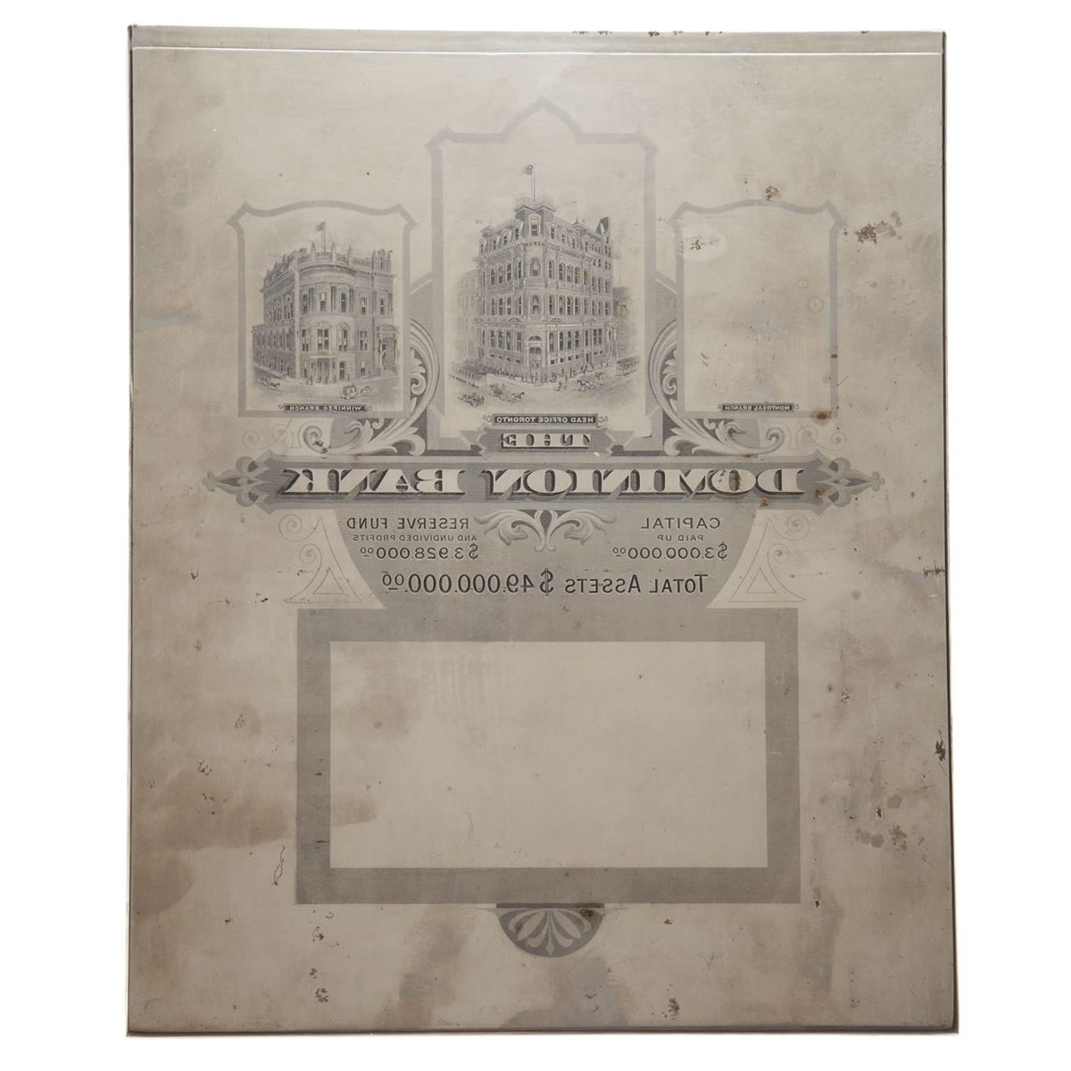 Circa late 1870s. A mirror image large format chrome plated steel printing plate. 10.5" x 13". Features "The Dominion Bank" in bold block lettering. "4,900,000.00 Total Assets", and engravings Toronto Head offfice building and Winnipeg branch building. A third area intended for Montreal branch engraving in blank as is a 3.5" x 6 square at bottom centre. Believed to be a printing plate for a calendar but another use is possible. Stamped "John Sellers & Sons, Sheffield, England" on back.