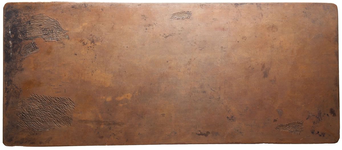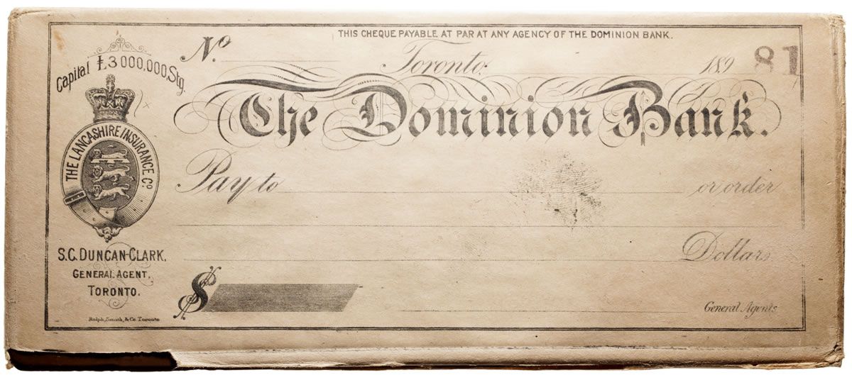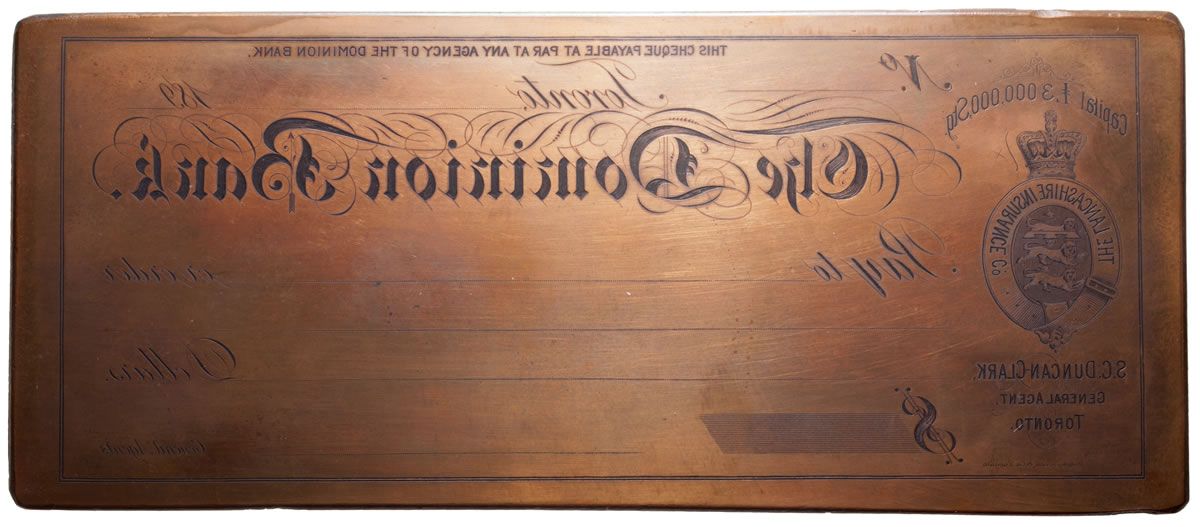 189_. A mirror image copper printing plate for Cheques for the Dominion Bank. Elaborately engraved calligraphy bank name with embellishments. Also features a detailed heraldic arms of The Lancashire Insurance Co. featuring a crown, garter and three lions.The plate has little toning and is deep orange-red. Measures 9.125" x 3.875". Imprint on front "Rolph Smith & Co. Toronto". Believed to be unique.