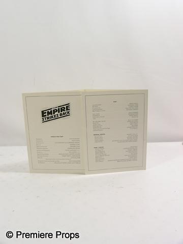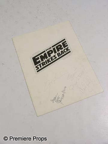 White, and black 'Star Wars The Empire Strikes Back' (1980) premiere program signed by Mark Hamill, Harrison Ford, and George Lucas. From a crewmember's private collection. (approx. 10" x 7 1/2")