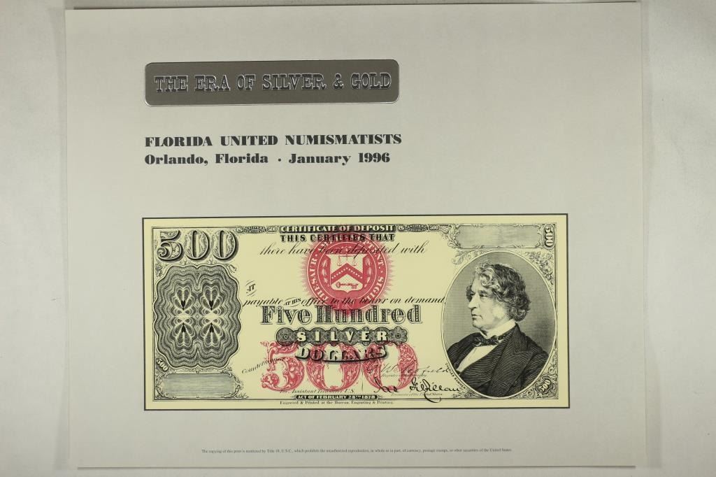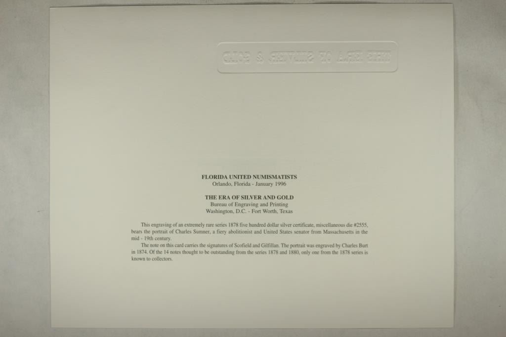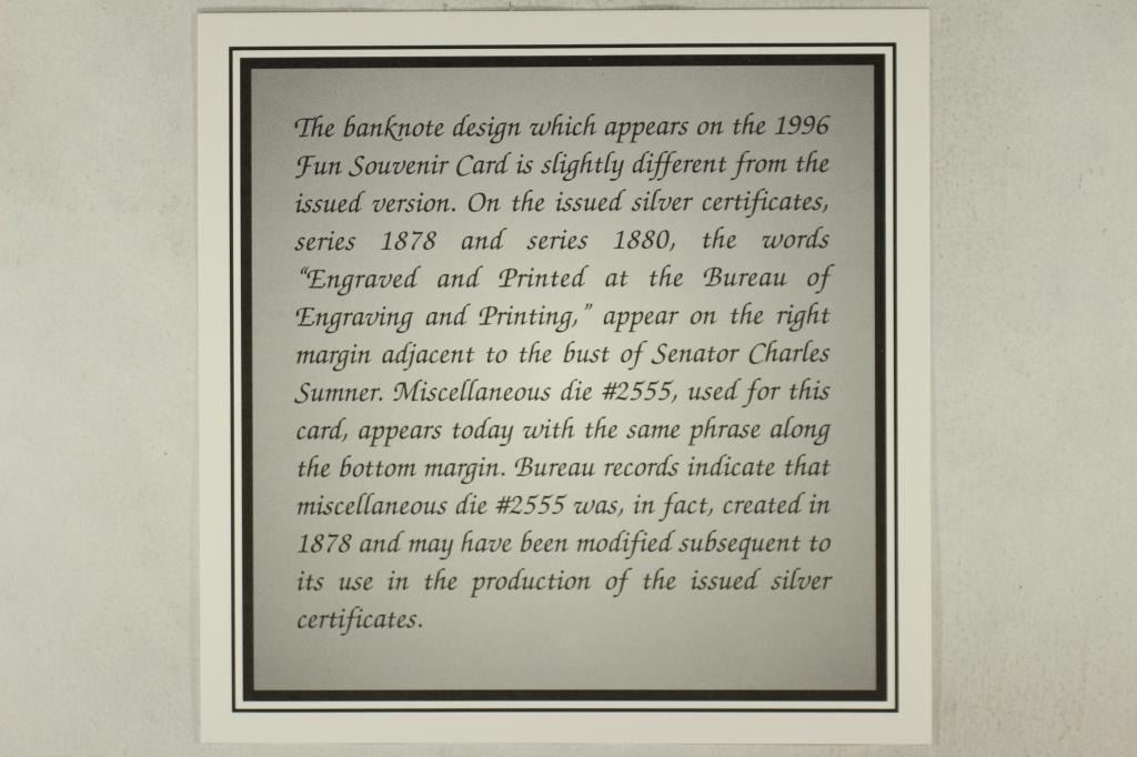 1996 SOUVENIR CARD PRINTED BY THE BEP WITH ENGRAVING OF AN EXTREMELY RARE SERIES 1878-$500 SILVER CERTIFICATE
