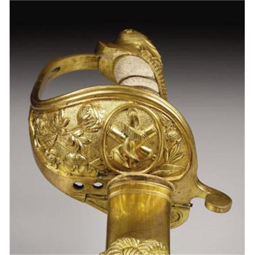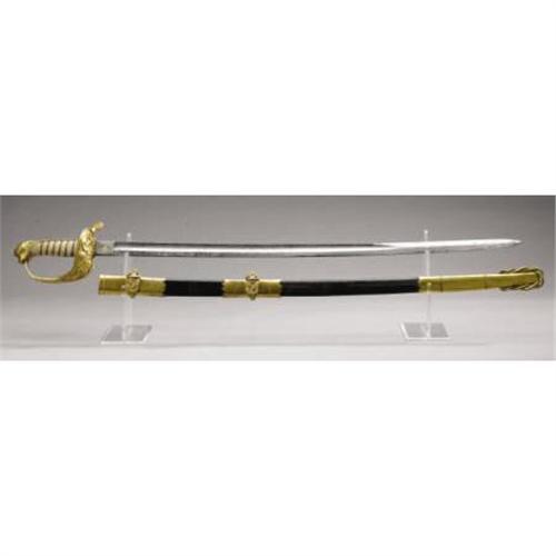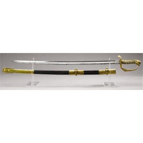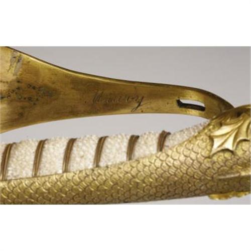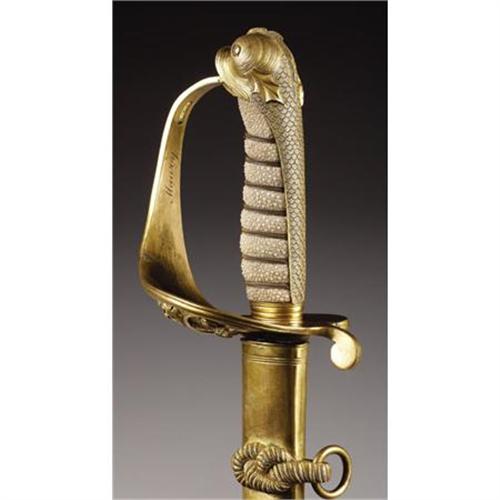 <B>EXCEEDINGLY RARE CONFEDERATE DOLPHIN HEAD NAVAL OFFICER’S SWORD AND SCABBARD OF COMMANDER WILLIAM LEWIS MAURY C.S.S. </B></I><B><I>GEORGIA</B></I></B></I><B>.</B></I> accompanied by: the original oil cloth storage case; a <I>carte de visite </B></I>of Maury in Confederate naval officer’s uniform wearing the sword; his original Confederate commission as a first lieutenant; his personal copy of William Fontaine Maury’s <I>Explanations And Sailing Directions...; </B></I>and a manuscript letter of safe passage issued by Brazil to Maury and the C.S.S. <I>Georgia</B></I> dated May 13, 1863 to operate off the coast of South America.. <BR><BR>The sword is inscribed in period script “Maury” on the inside of the knuckle bow. William Lewis Maury was born in 1813 in Caroline County Virginia and appointed acting midshipman in the United States Navy in 1829. He passed midshipman in 1835. He was promoted to lieutenant in 1841 and accompanied Commodore Matthew C. Perry, as part of the East India Squadron, on Perry’s Japan Expedition. Maury commanding the barques <I>Caprice</B></I> and <I>Mississippi</B></I>. Maury returned home in 1854 and served on the Navy Retirement Board in 1855. With the outbreak of the Civil War, Maury resigned his commission and joined the fledgling Confederate Navy. Maury was commissioned a first lieutenant in the Confederate Navy on June 10, 1861. He was promoted commander on February 17, 1863. He commanded the C.S.S. <I>Tuscaloosa </B></I>(1861-1862) and<I> </B></I>the C.S.S. <I>Georgia</B></I> (1863 - 1864). He also served a brief stint commanding the C.S.S. <I>North Carolina </B></I>before exiting the service on sick leave. The C.S.S. <I>Georgia</B></I> was purchased in England through the agency of his famous cousin Matthew Fontaine Maury and was active in the Atlantic capturing numerous prizes. The Georgia was eventually captured off the coast of Lisbon Portugal after she had been sold to an English merchant and was no longer in Confederate service. <BR><BR>The sword was acquired form a direct lineal descendant of William Lewis Maury by Donald Tharpe. The exquisitely executed brass guard incorporates deeply cast relief motifs of tobacco and cotton plants extending from the knuckle bow into the basket with the insignia of the Confederate States Navy, a fouled anchor on crossed cannons in the center, all on a stippled background. The dolphin head pommel is beautifully detailed with hand engraved motif of scales and stippling on the backstrap. The reverse counter guard folds down onto a pin on the back of the top scabbard mount. White fish skin grip with spring like brass wire bordered with single strand brass wire wrap. Retains the original buff leather washer. The 29 5/8” blade is deeply etched on the obverse with cotton and tobacco plants, floral/scroll motifs and the 1st National Confederate Flag on an anchor in the center. The ricasso is etched with a six pointed star with a small brass medallion inset in the center displaying the word “Proof”. The reverse of the blade also depicts cotton and tobacco plants, floral/scroll work and the Confederate States Navy insignia, identical to that on the guard, in the center. The ricasso is etched “Firmin & Sons/153/Strand/& 13/Conduit St./London”. All etching is highlighted with exquisite hand engraved details. Brass mounted black leather scabbard. Ring mounts cast in the form of figure eight rope knots and beautifully finished as is the drag which incorporates intertwined serpents. The bottom mount is 8 ½” long. Brass carrying rings. The original storage case (the only example extant that we are aware of) is padded with an oil cloth exterior and chamois lining. The flap closes with a Japanned button and string ties, fits the sword perfectly. The <I>carte de visite </B></I>of Maury bears the backmark of Maison Rideau in Cherbourg (France) and is inscribed in period ink script on the verso “<I>from Uncle Lewis Maury sent to me in Paris, 1863</B></I>”. <BR><BR>Maury’s personal copy of Matthew Fontaine Maury’s monumental work, <I>Explanations And Sailing Directions To Accompany The Wind and Current Charts </B></I>published in 1855 is signed in ink script by Maury on the front leaf. Beautiful custom gilt decorated full leather binding. With gilt edged pages. 9 3/4” X 11 ½” and 2 ½” thick with 869 pp. and 23 plates/maps. A very rare book.<BR><BR>Only a handful of these beautiful swords are known to exist with but a few having the historical significance, impeccable provenance, and superb condition of this magnificent specimen.<BR><BR><B>Provenance:</B></I><I> The Tharpe Collection of American Military History</B></I><BR><BR><B>Exhibited: </B></I><I>The Liberty Heritage Society Museum</B></I><BR><BR><b>Shipping:</b> Miscellaneous Collectibles, Smal (<a target="_blank" href="http://www.heritageauctions.com/common/shipping.php">view shipping information</a>)