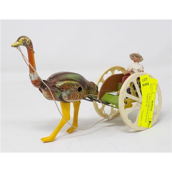 ANTIQUE TIN OSTRICH PULLING CART MECHANICAL