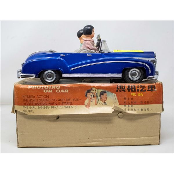 LARGE TIN PHOTOGRAPH COUPLE IN CAR W BOX