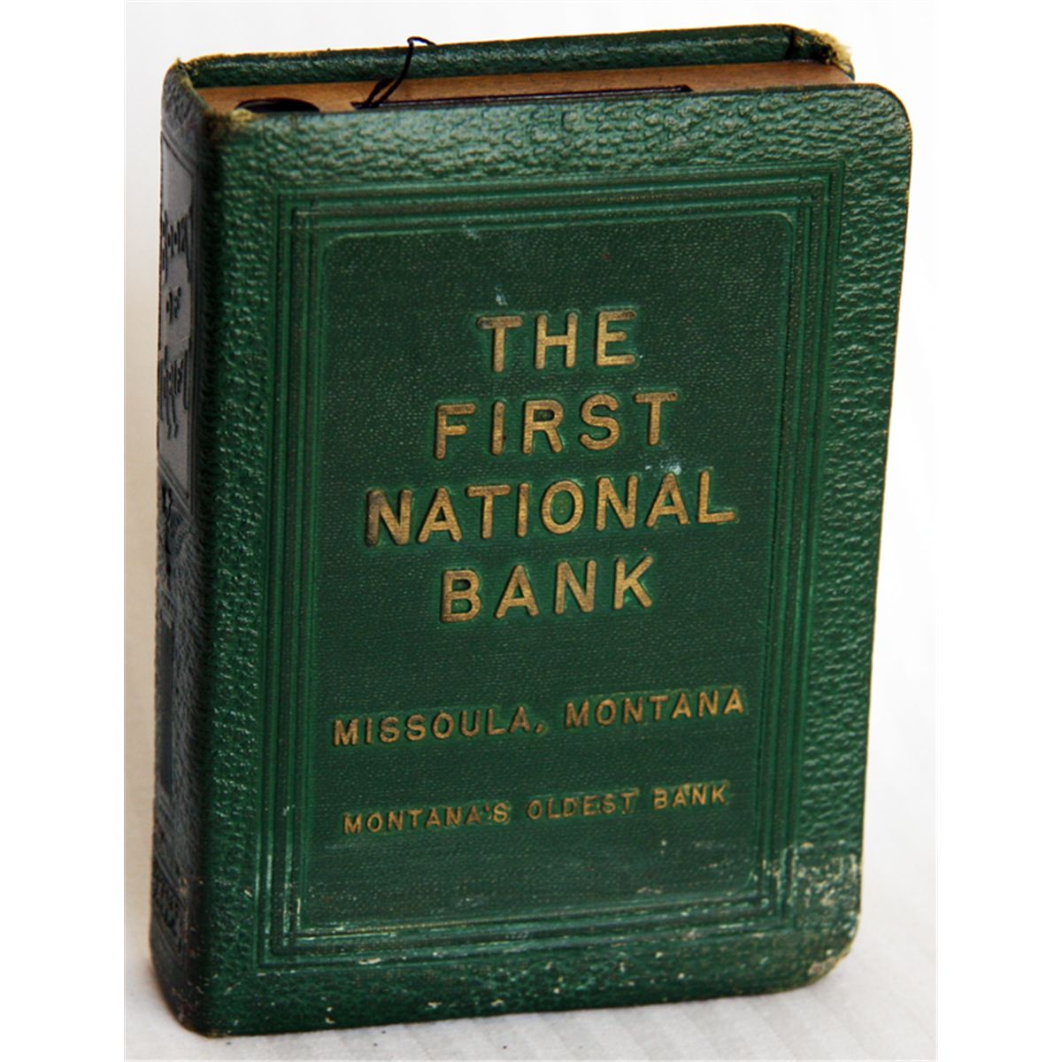THE FIRST NATIONAL BANK, MISSOULA, MONTANA. Montana’s Oldest Bank. Coin slot on top. Key lock, key present. No serial number. 8cm x 11 1/2cm x 2 1/2cm. ‘Book of Thrift’ on spine’. Green cloth or leatherette cover. Maker-Bankers Utilities Co., San Francisco. Patented July 3, 1923. Fine.