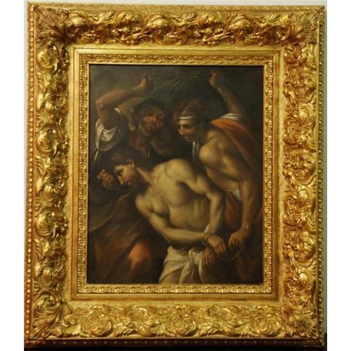 DESCRIPTION: THE FLAGELLATION OF CHRIST. The painting the we propose you depicts the moment of the Flagellation of Christ. The atmosphere is very dense, the handling of paint is so fluent that the cruel action taking place has its own powerful rhythm. The viewer is caught up in the horror. The near-naked Christ is being twisted into position by the torturer on the right while the torturer on the left tears at his hair. The process, the flagellation column, usually a decisive motif, does not appear, the symbol of Christ is not present but we can feel its presence, its drama, the whole composition is immersed in the blackness of the background. It is characterized by a diffuse, atmospheric luminosity and a classically monumental composition, sustained by a refined chromatic sensibility and vibrations of colour. Likewise, the extremely free and summary brushstroke that recomposes itself to the eye from a certain distance is a hallmark of our artist?s work.