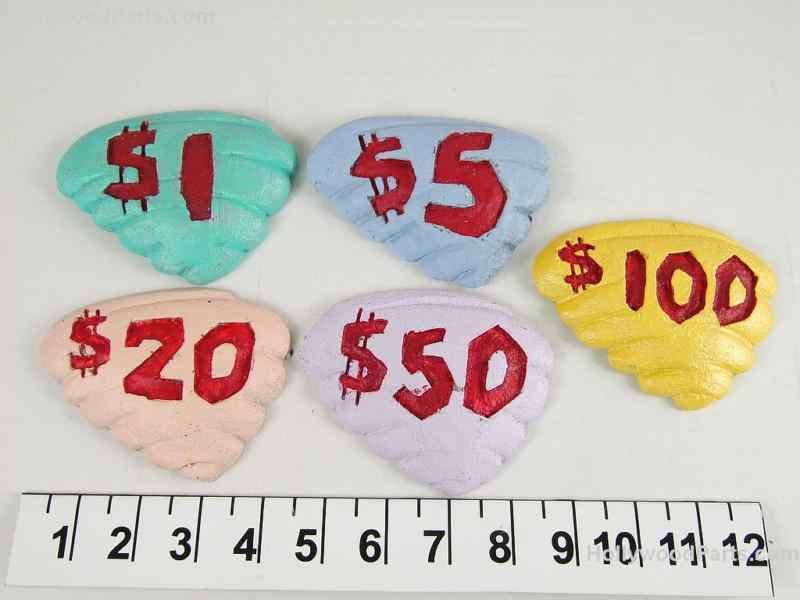 Offered here are 176 dollars worth of bedrock money clams from The Flintstones Viva Rock Vegas that make a great display. One of each currency. These clams [Bedrock Money] each have excellent detail.