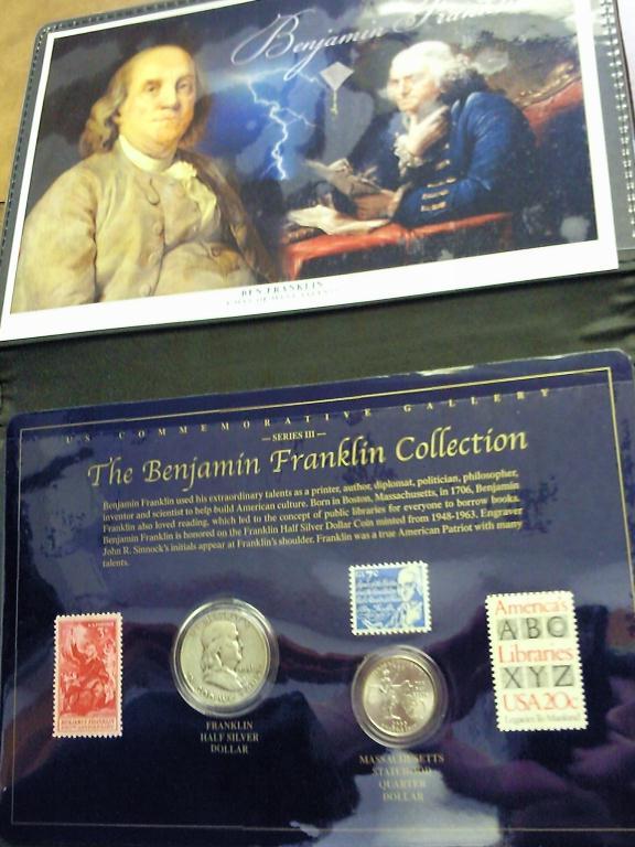 FRANKLIN HALF DOLLAR. MASS. QUARTER AND THREE MINT STAMPS