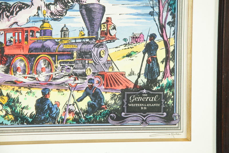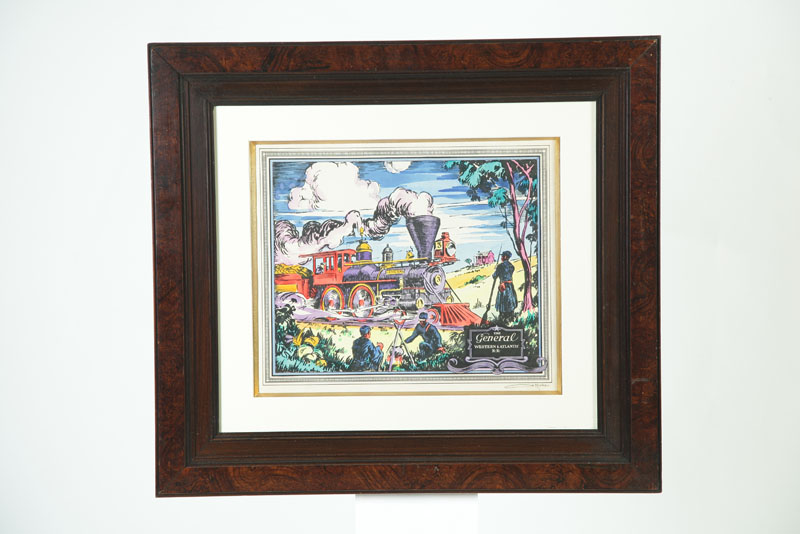 Handcolored print, illegible signature lower right. Brightly colored depiction of the Civil War engine "The General" speeding down the track, past camping soldiers. In a frame, 21 1/2"h. 24"w.