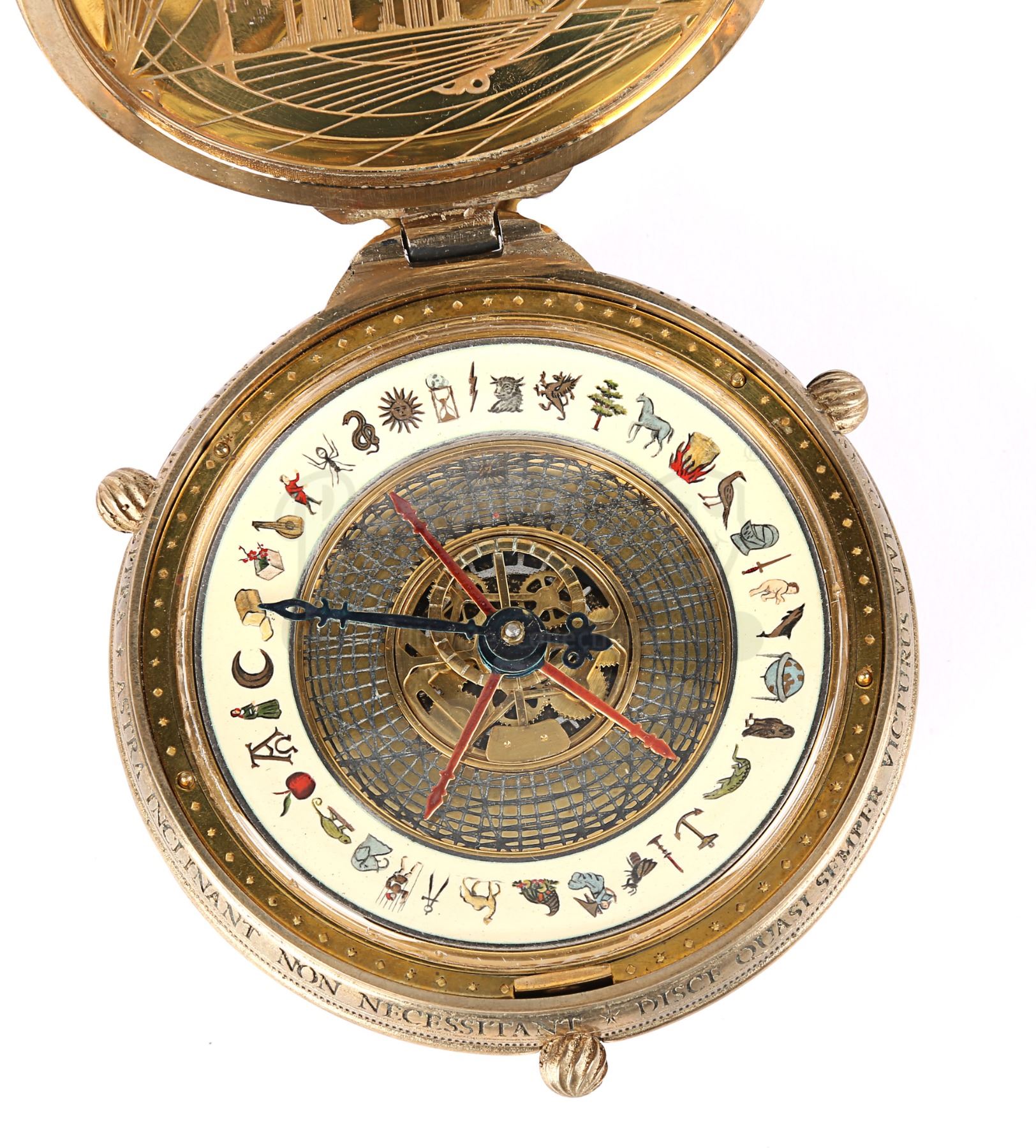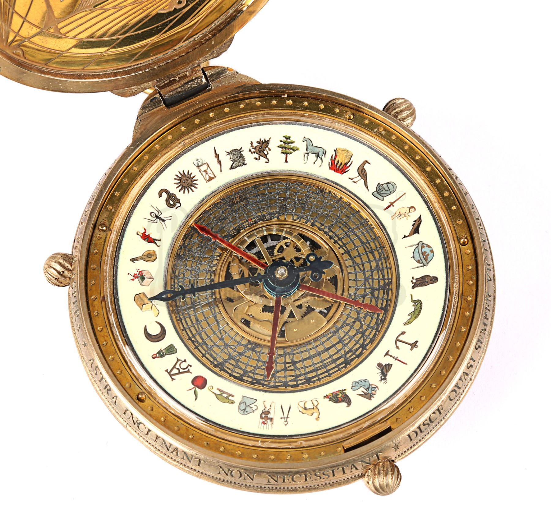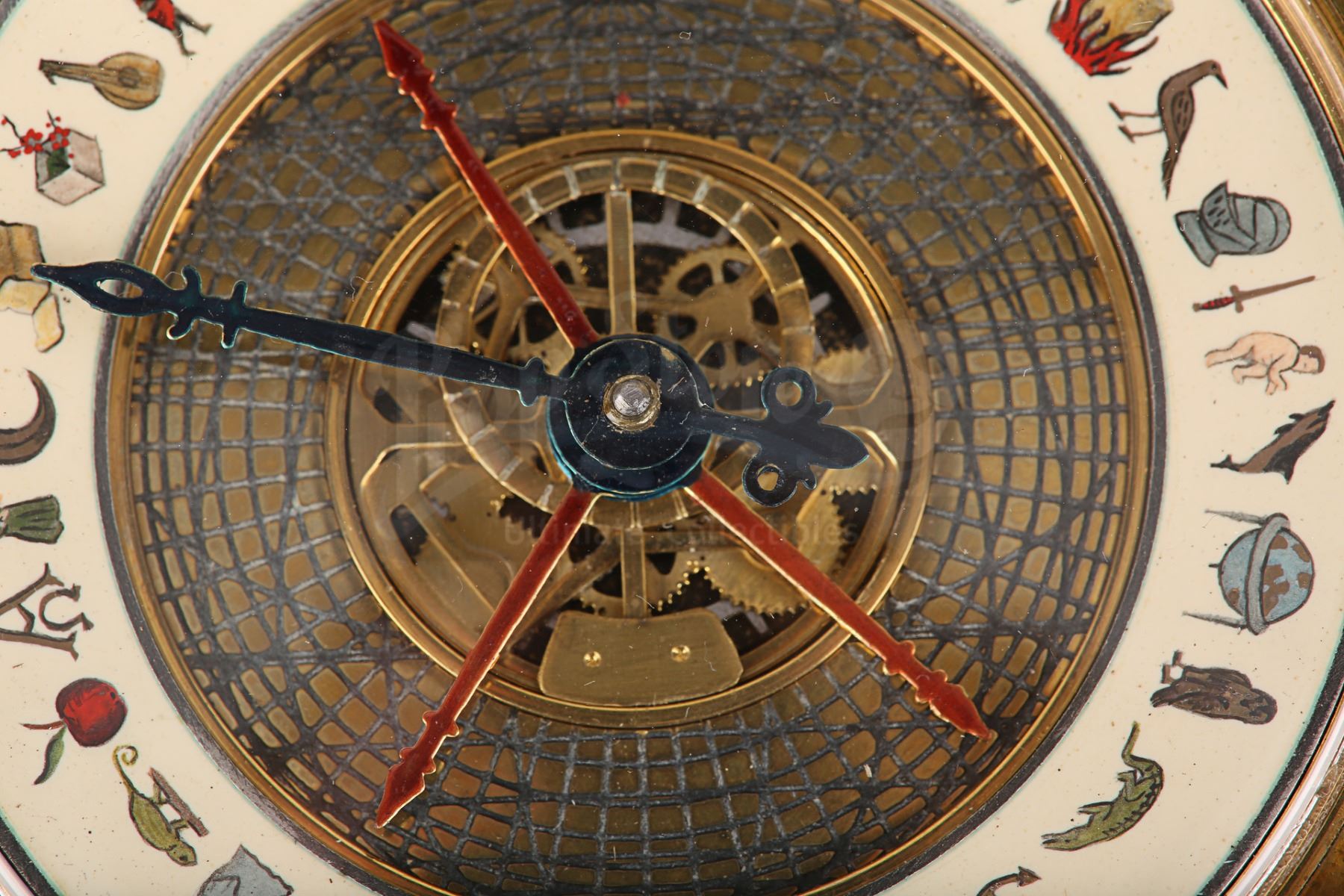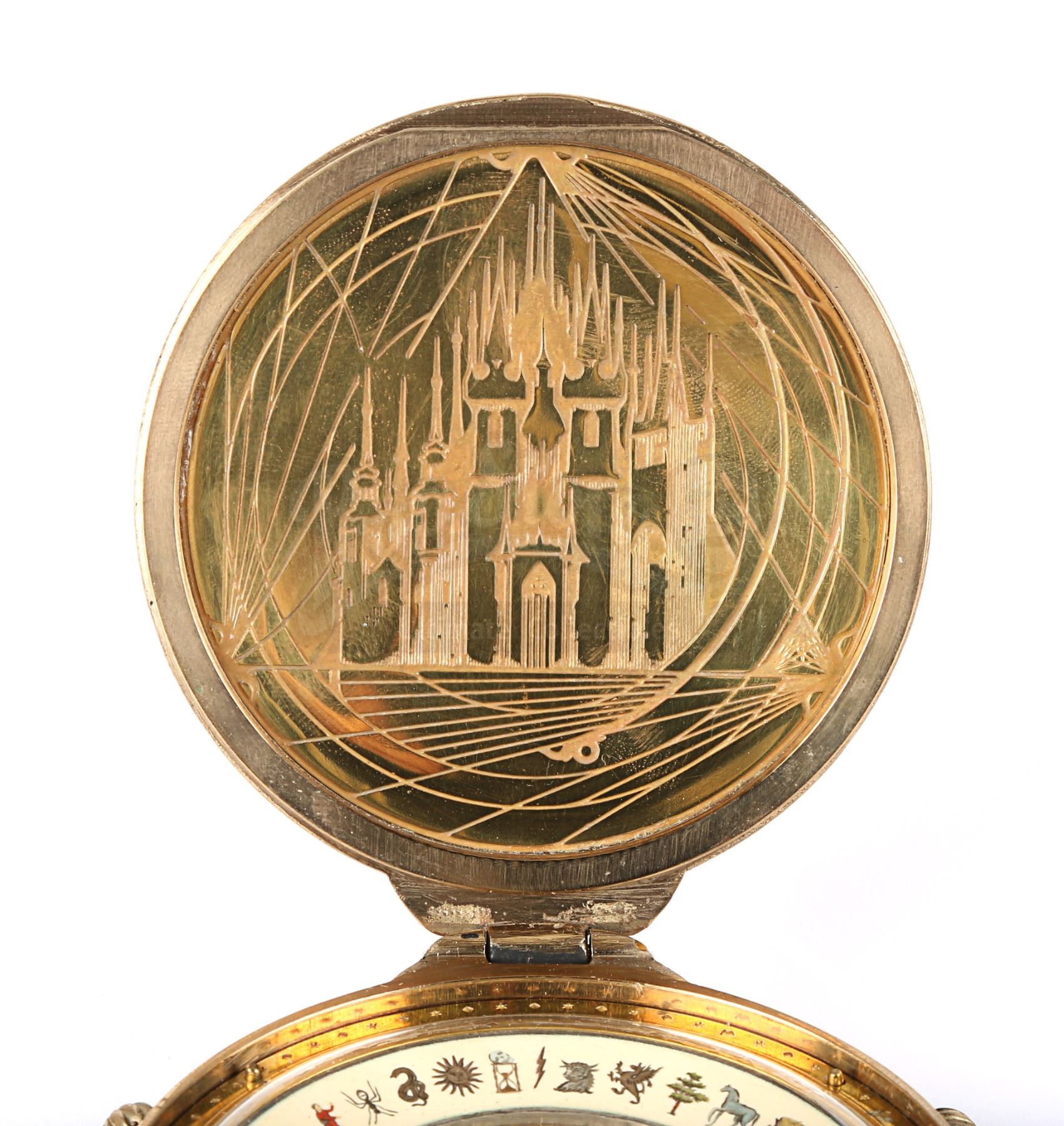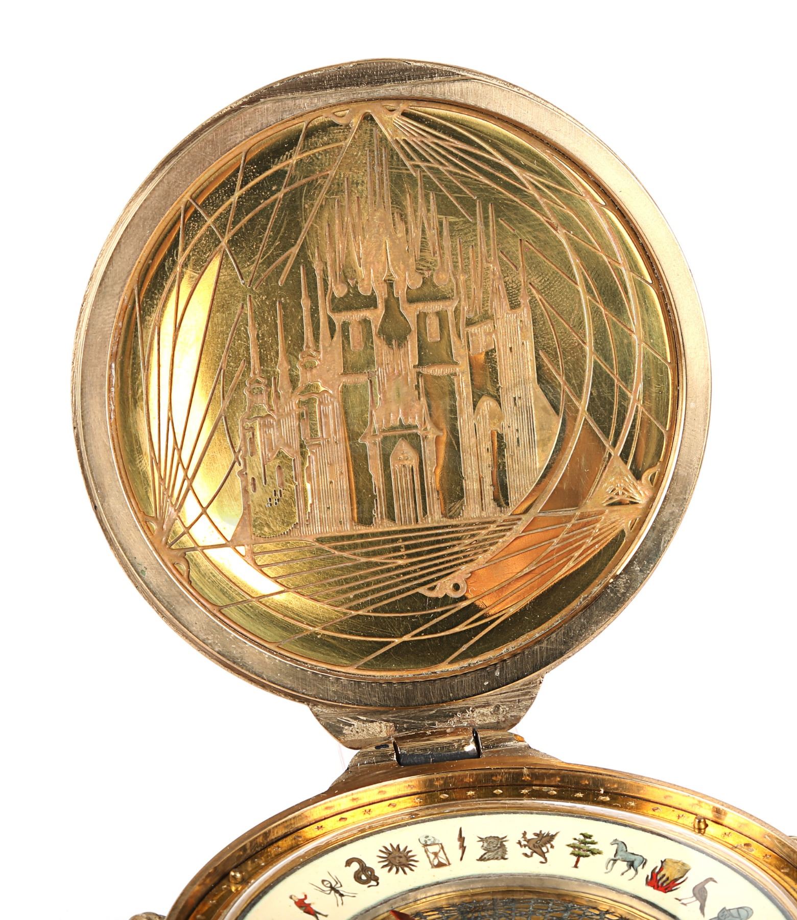 Intricately engraved symbols and numbers decorate the outer shell, and the lid pops open when the device's square-shaped switch is pressed. An image of Prague's Church of Our Lady before Týn - the place where the alethiometer was supposedly invented - adorns the underside of the lid. Housed under a plastic cover, the compass face displays several decorative cog components at its centre, with four hands and a cream-coloured dial featuring 36 symbols expertly hand-painted by enamel artist Keith Seldon. Three of the hands are red, and are controlled via a trio of winding crowns; the fourth, larger hand is black, and moves with the twisting of a circular mechanism located at the base of the alethiometer.
