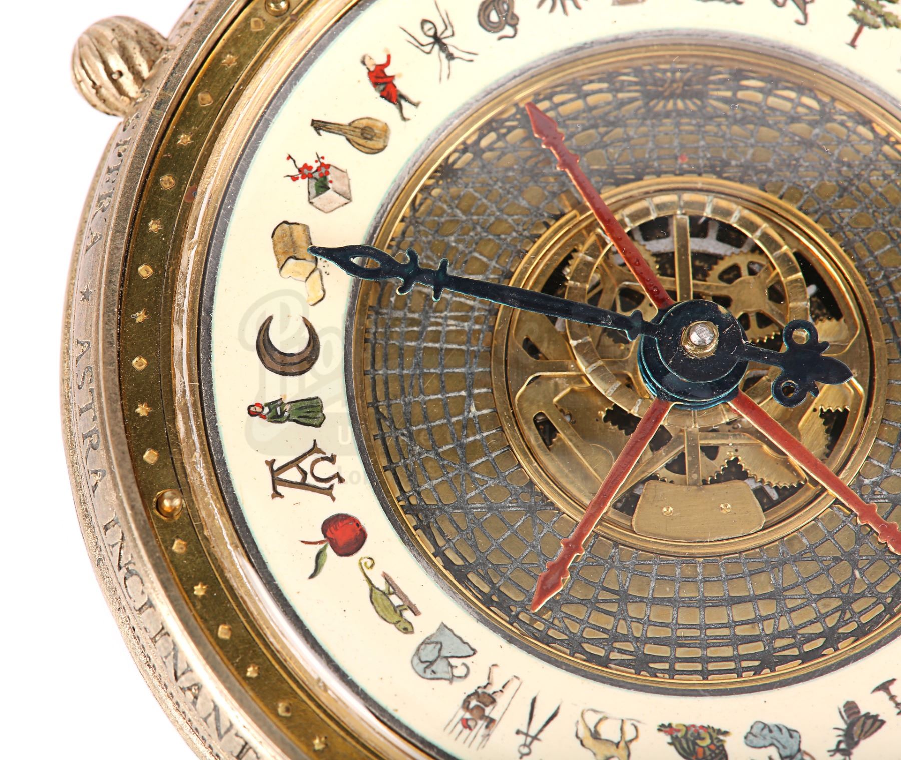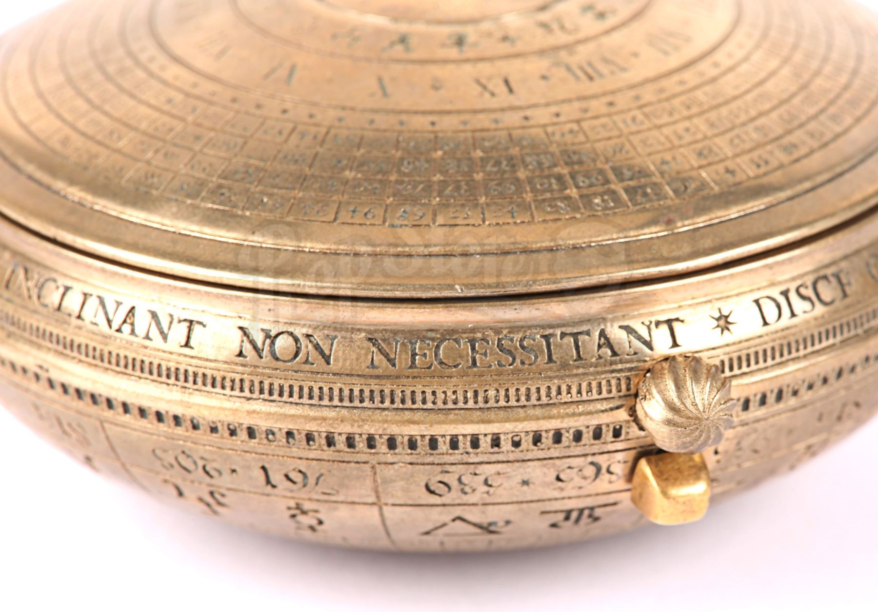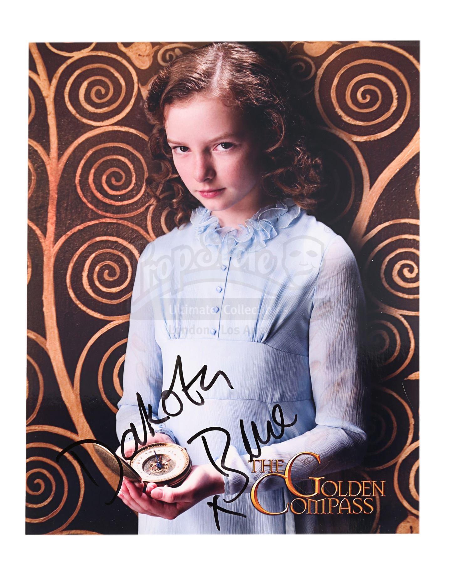 Accompanying the lot is a promotional photograph of Lyra holding the device, autographed by Dakota Blue Richards in black ink. The exterior casing was intentionally distressed for the production, and the photograph exhibits light surface scratches. Dimensions (alethiometer, closed): 10 cm x 8.5 cm x 3.5 cm (4" x 3 1/2" x 1 1/2"); (photo): 25.5 cm x 20.5 cm (10" x 8")