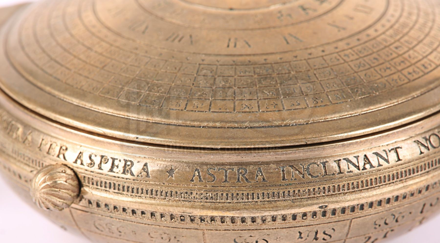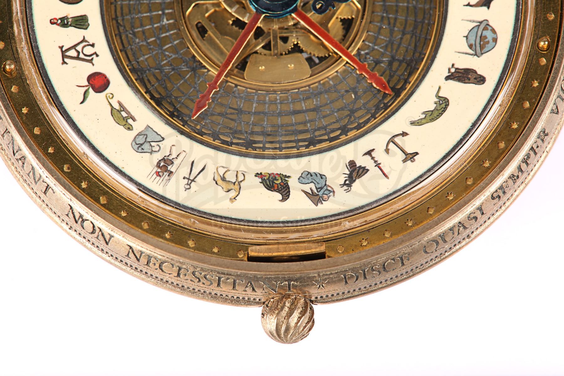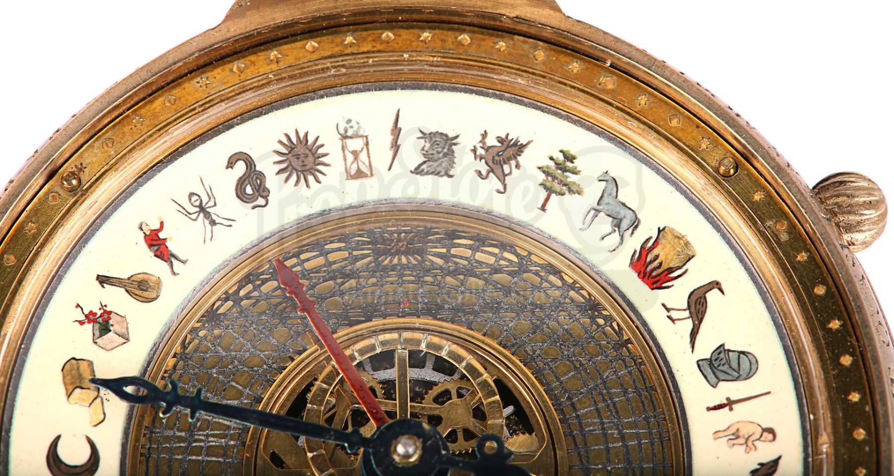 Accompanying the lot is a promotional photograph of Lyra holding the device, autographed by Dakota Blue Richards in black ink. The exterior casing was intentionally distressed for the production, and the photograph exhibits light surface scratches. Dimensions (alethiometer, closed): 10 cm x 8.5 cm x 3.5 cm (4" x 3 1/2" x 1 1/2"); (photo): 25.5 cm x 20.5 cm (10" x 8")