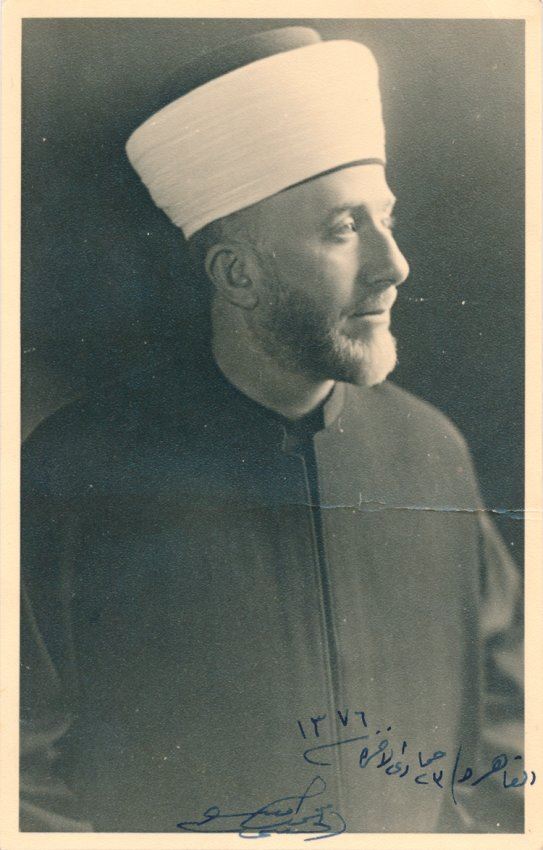 Mohammed Amin al-Husseini (1897-1974) Palestinian Arab nationalist and Muslim leader. During World War II he collaborated with both Italy and Germany by making propagandistic radio broadcasts and by helping the Nazis recruit Bosnian Muslims for the Waffen-SS. Later overshadowed by the P.L.O. Rare S.P. 3 ?" x 5 ?" b/w, a half-length pose signed in Arabic at bottom. Fine.