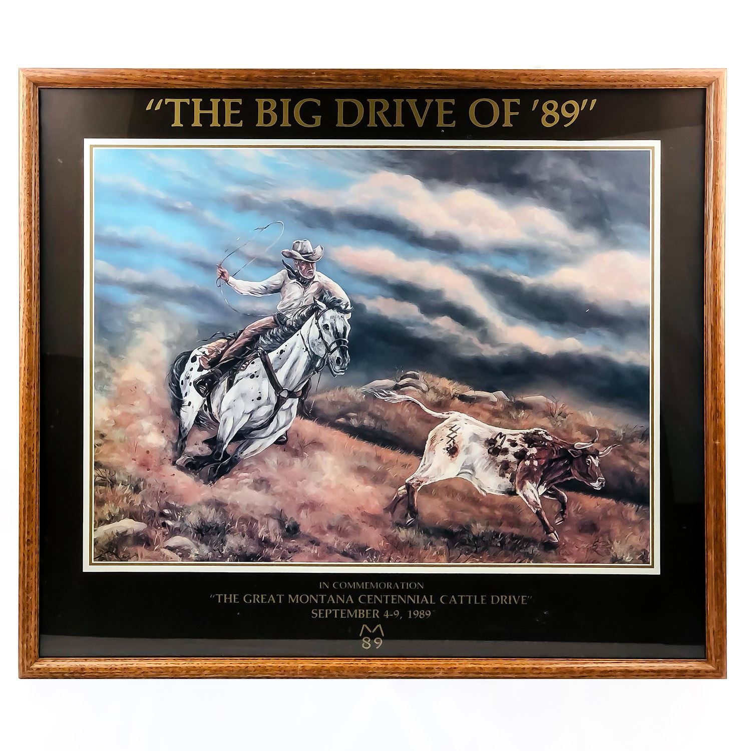 #8984 - IN COMMEMORATION “THE GREAT MONTANA CENTENNIAL CATTLE DRIVE” SEPTEMBER 4-9, 1989 - “THE BIG DRIVE OF ’89”. FRAMED AND UNDER GLASS. FRAME MEASURES: 29.25” (74.5 CM) LONG BY 25.25” (64 CM) HIGH***ITEM(S) LOCATED IN LETHBRIDGE ALBERTA. FREE TRANSPORT TO EDMONTON OFFICE AVAILABLE FOR THIS AUCTION. WORLDWIDE SHIPPING IS AVAILABLE FOR ALL ITEMS