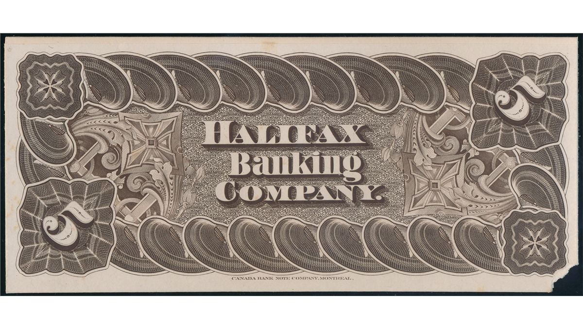 THE HALIFAX BANKING CO. $5.00. 1887 Issue. CH-325-22-02-02BP. A Back Proof in brown tint on card. 1/3" off the lower right corner.