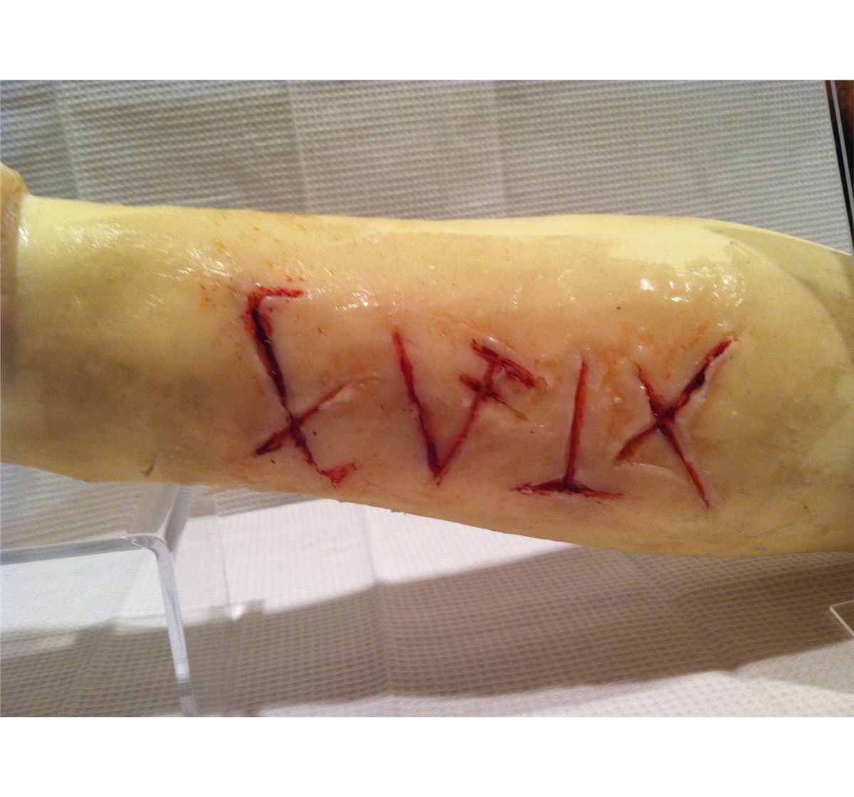 It is made of foam with a silicone appliance to simulate cuts in flesh.