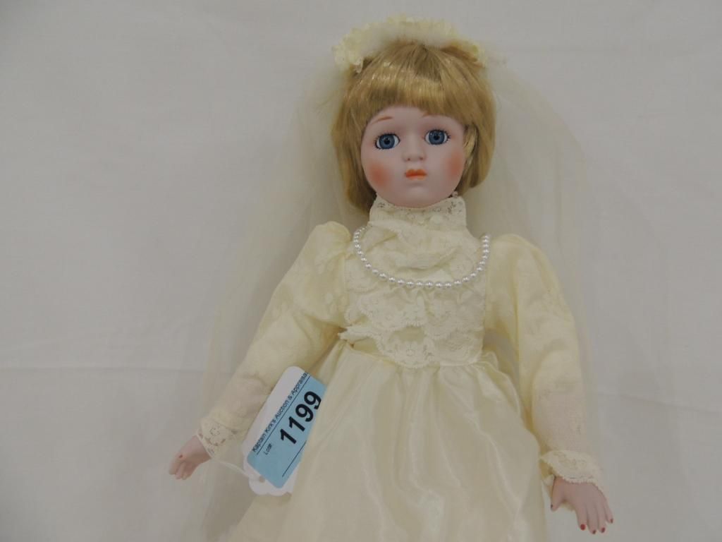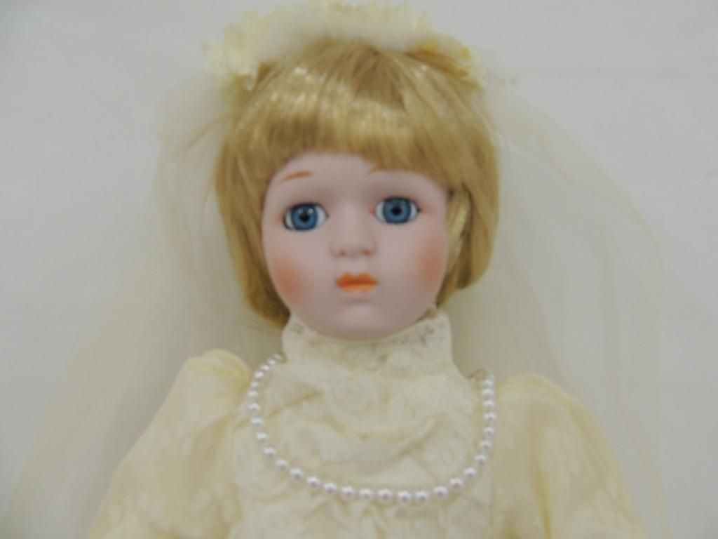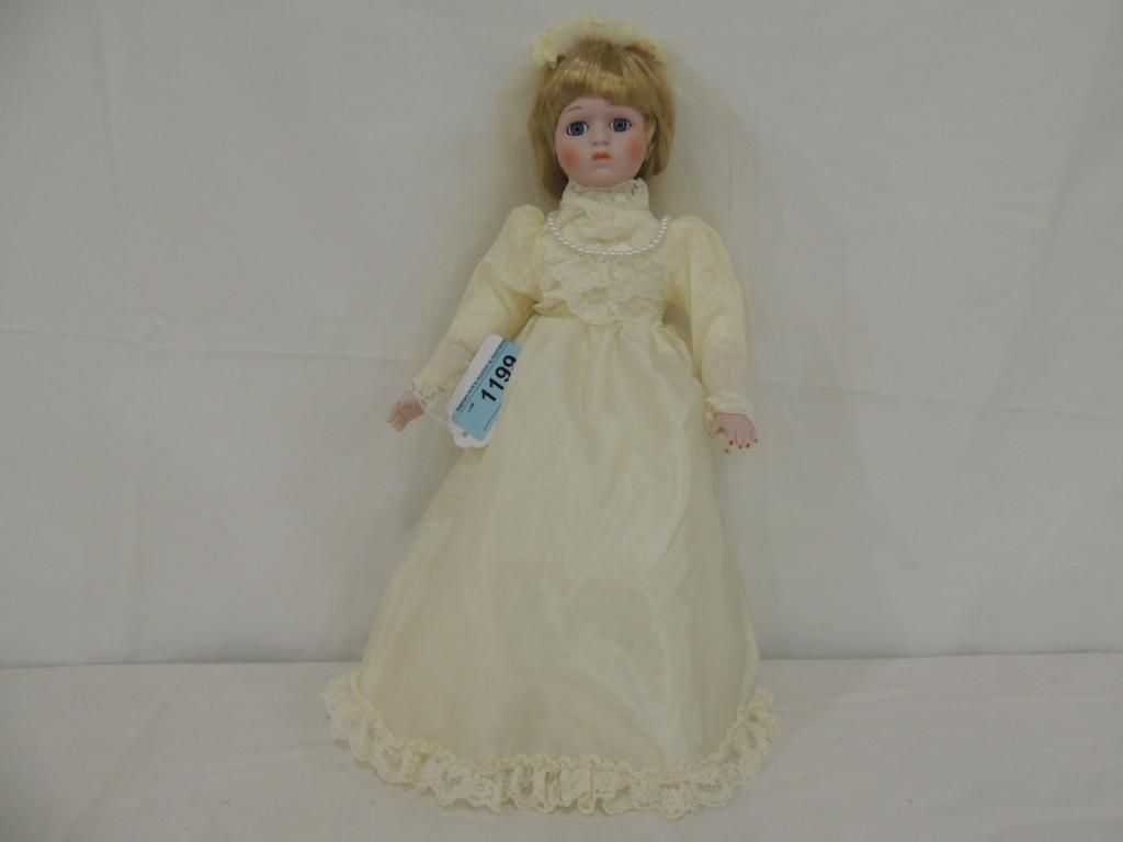 PORCELAIN DOLL BRIDAL DOLL LACE AND SATIN WEDDING DRESS. HERITAGE MINT. AS SHOWN. SEE PHOTO FOR MORE DETAILS.