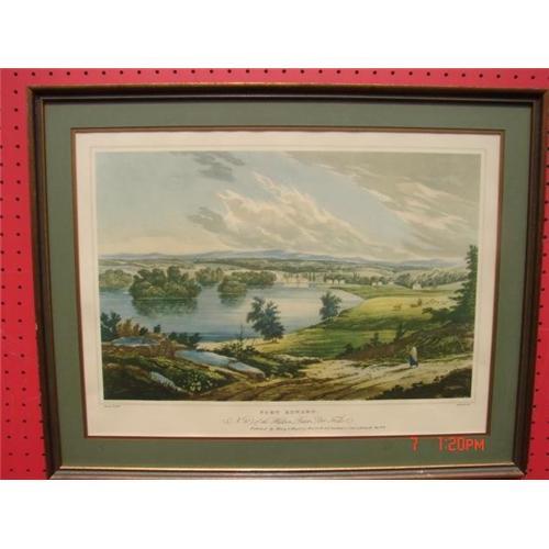 The Hudson River Portfolio contains twenty aquatints views of the Hudson River Valley engraved by John Hill after paintings by William G. Wall. Published by Henry I. Megarey, New York. The Hudson River runs 315 miles from the Adiriondack Mountains to New York City. The views start near Lake Luzerne and end with a view of New York City from Governor's Island. The original proposal was for twenty four(24) prints; however only twenty were ever published between 1821-1825. This particular one is #10 which is the scene of Fort Edward. Fort Edward is situated on the east bank of the Hudson, two miles south of Sandy Hill, and about eleven miles north of Fort Miller Bridge. After much investigation--This is not a Original BUT restrikes from about 40-50 years ago. Originals are worth about $6000-$8,000.
