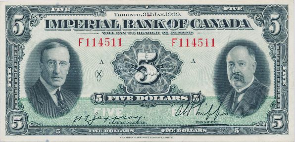 THE IMPERIAL BANK OF CANADA. $5.00. Jan. 3, 1939. CH-375-24-02. No. F114511/A. Signed Jaffray-Phipps. BCS graded Very Fine-25.