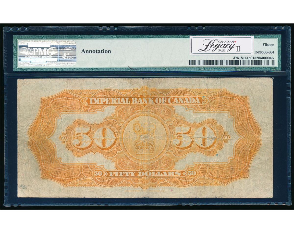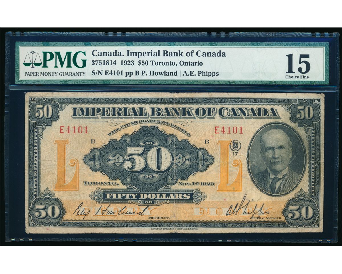 THE IMPERIAL BANK OF CANADA. $50.00. Nov. 1st, 1923. CH-375-18-14. Howland-Phipps. No.E4101/B. PMG graded Choice Fine-15. From the Rosedale Collection.