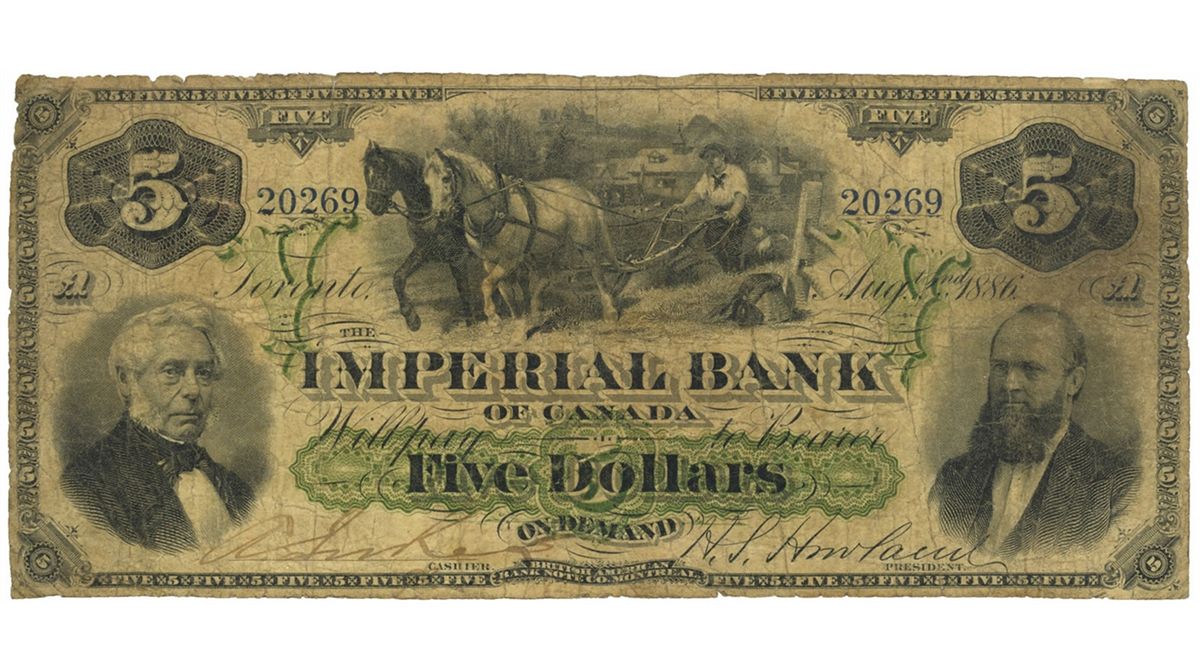 $5.00. Aug. 1, 1886. CH-375-10-12. No. 20269/A. PMG graded Fine-12. Net. Designated as in an Institutional Collection only in the current (7th) edition of the Charlton catalogue. An absolute rarity, excessively rare and the only example available outside of museums. Minor and insignificant minor splits.