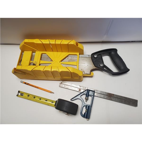 METER BOX WITH T-SQUARE, MEASURING TAPE AND SAW