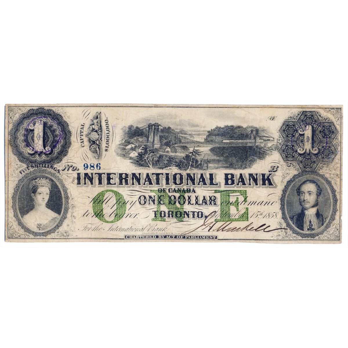THE INTERNATIONAL BANK OF CANADA. $1.00. Sept. 15, 1858. Bridge. CH-380-10-06-06. Signed J.H. Markell. Green ‘word’ Protector. Small Blue Serial number 986/B. One pin hole. Very Fine.