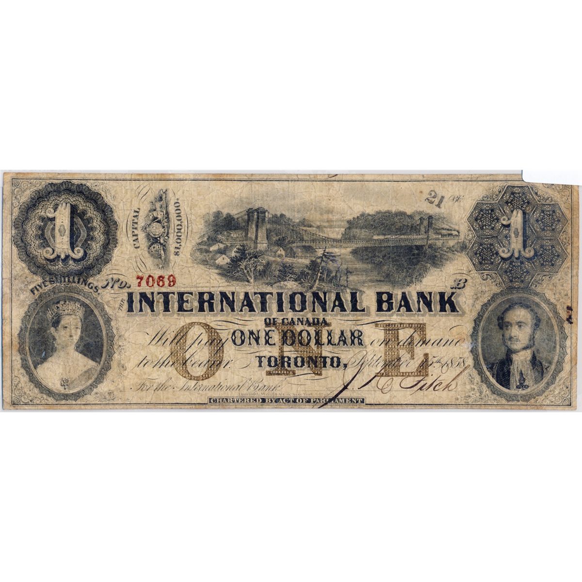 THE INTERNATIONAL BANK OF CANADA. $$1.00. Sept. 15, 1858. Bridge. CH-380-10-08-08. Signed J.R. Fitch. Brown ‘word’ Protector. Small Red Serial number 7069/B. ‘21’ stamped on front. “HARVEYS BRISTOL” stamped on back. VG+.