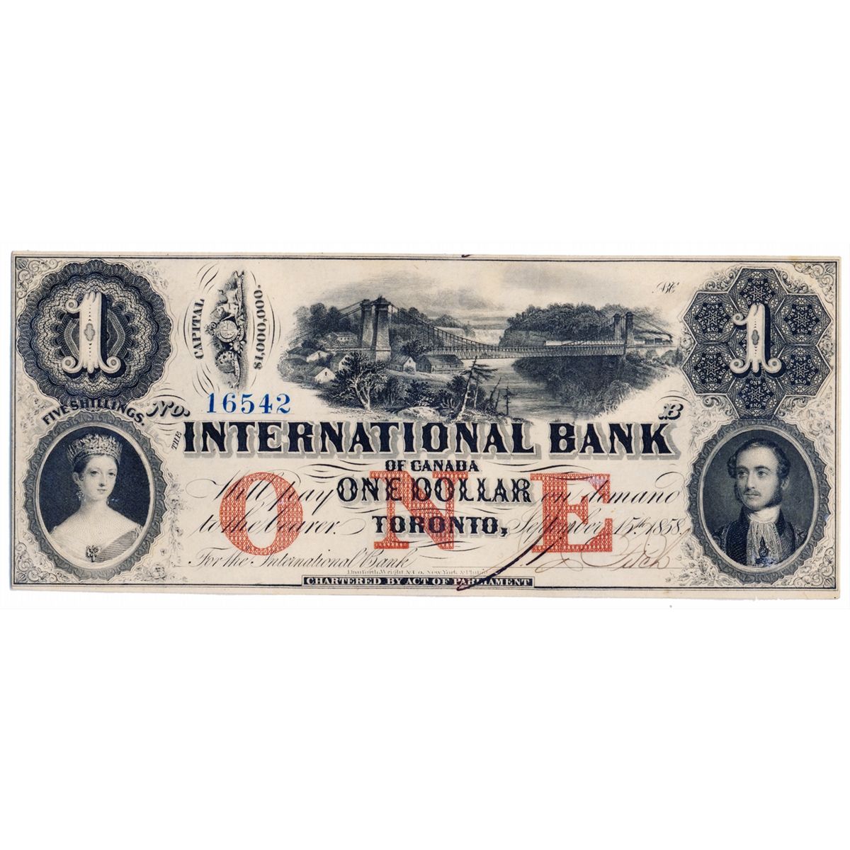 THE INTERNATIONAL BANK OF CANADA. $1.00. Sept. 15, 1858. Bridge. CH-380-10-10-08a. Signed J.R. Fitch. Red ‘word’ Protector. Large Blue Serial number 16542/B. AU.