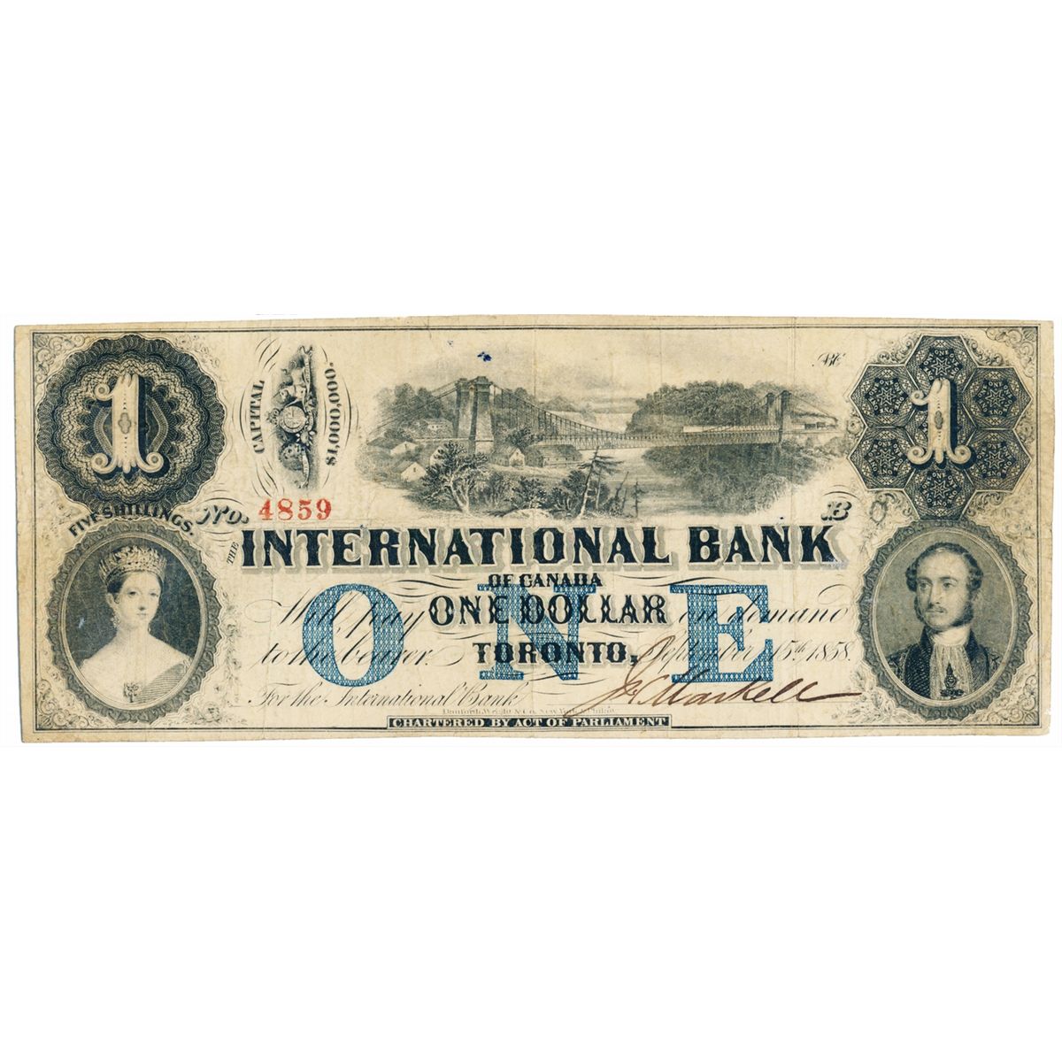 THE INTERNATIONAL BANK OF CANADA. $1.00. Sept. 15, 1858. Bridge. CH-380-10-16-06. Signed J.H. Markell. Blue ‘word’ Protector. Small Red Serial number 4859/B. Fine.