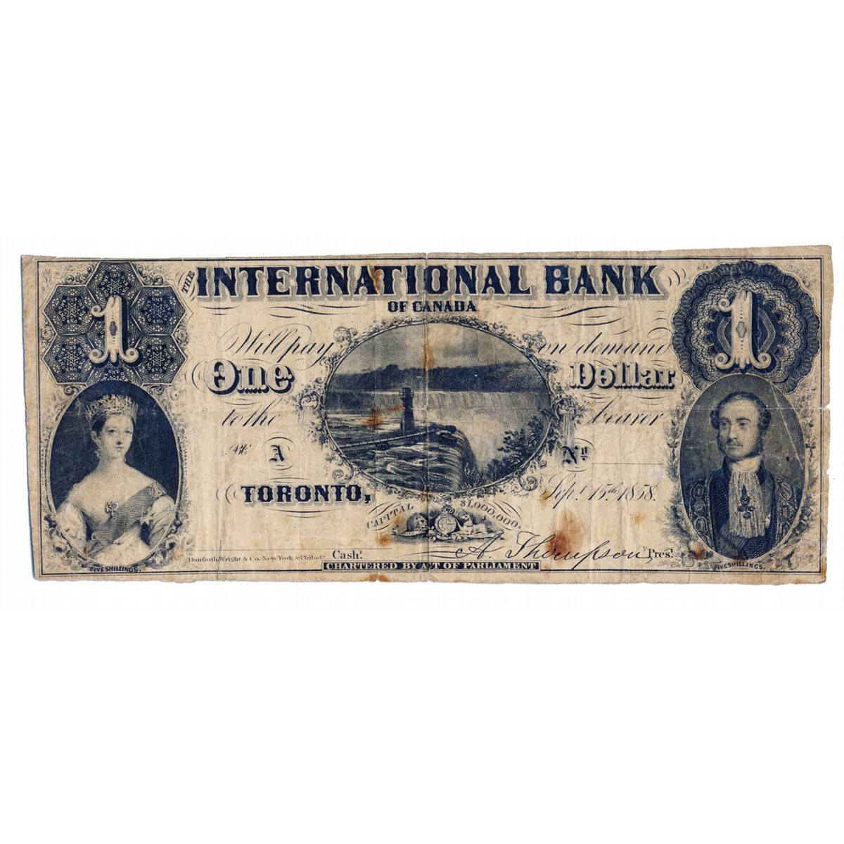 THE INTERNATIONAL BANK OF CANADA. $1.00. Sept. 15, 1858. CH-380-10-02-02R. Falls. Signed Thompson. No Protector. No Serial number. Fine.