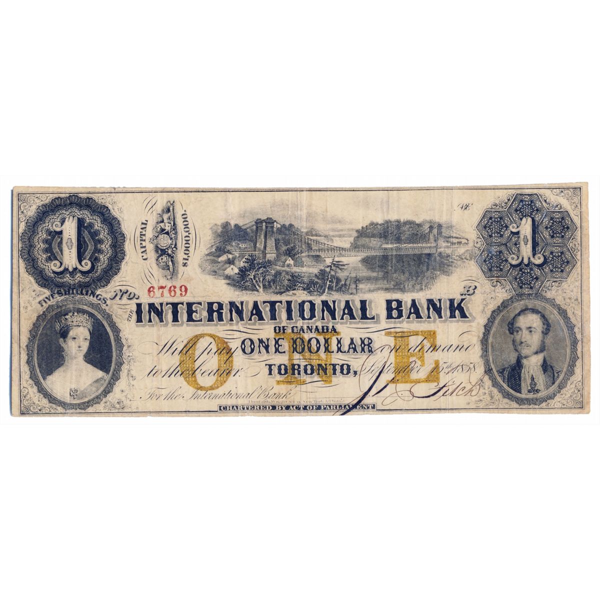 THE INTERNATIONAL BANK OF CANADA. $1.00. Sept. 15, 1858. CH-380-10-12-08. Bridge. Signed J.R. Fitch. Ochre ‘word’ Protector. Small Red Serial number 6769/B. Fine+.