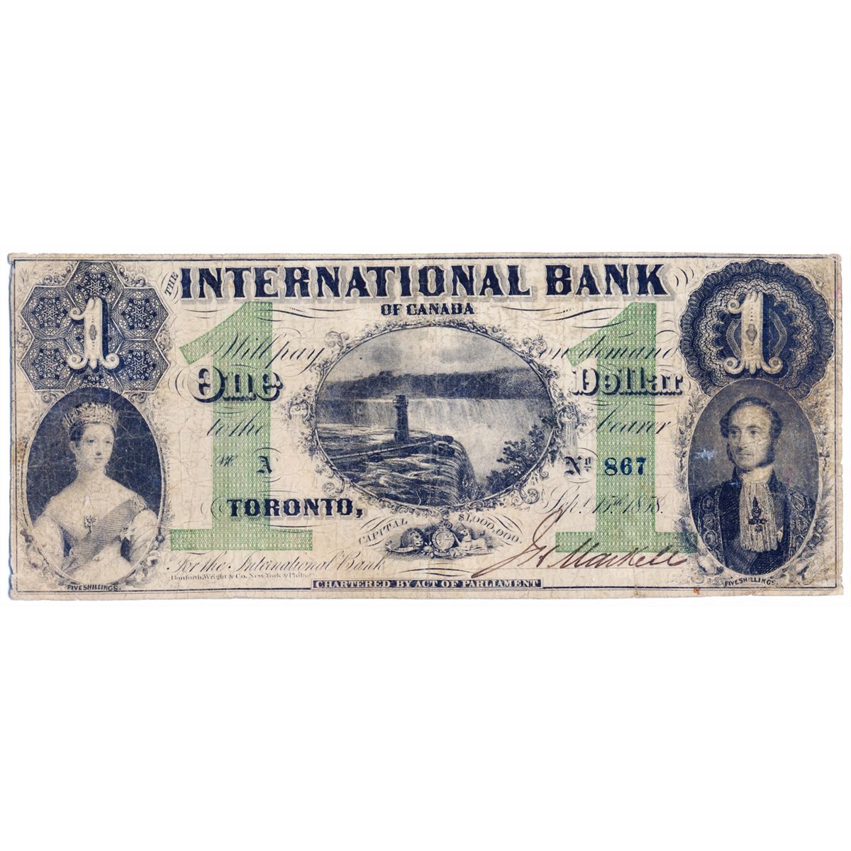 THE INTERNATIONAL BANK OF CANADA. $1.00. Sept. 15, 1858. Falls. CH-380-10-06-02. Signed J.H. Markell. Green ‘numeral’ Protector. Small Blue Serial number 867/A. ‘Harvey’s…’ stamp on back. Fine.