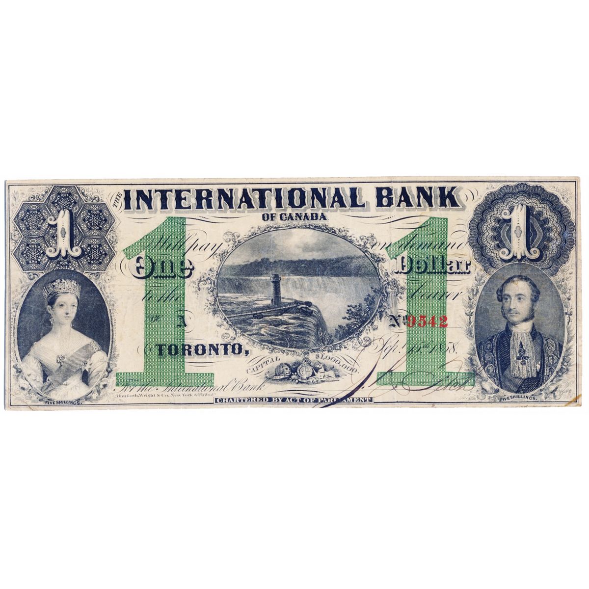 THE INTERNATIONAL BANK OF CANADA. $1.00. Sept. 15, 1858. Falls. CH-380-10-06-04. Signed J.R. Fitch. Green ‘numeral’ Protector. Small Red Serial number 9542/A. Very Fine.
