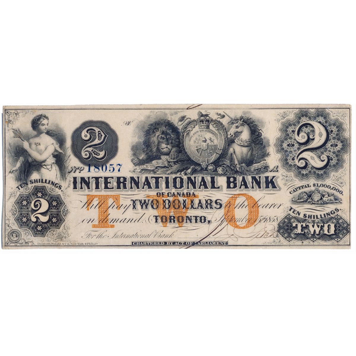 THE INTERNATIONAL BANK OF CANADA. $2.00. Sept. 15, 1858. CH-380-10-12-12b. Signed J.R. Fitch. Ochre ‘word’ Protector. Large Blue Serial number 18057/A. Very Fine+.