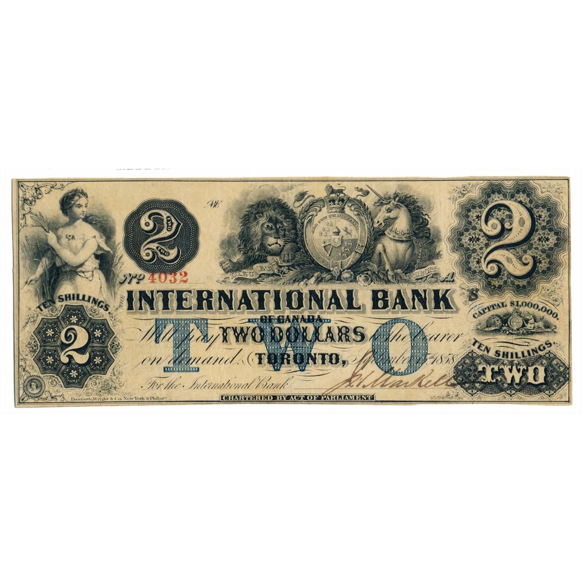 THE INTERNATIONAL BANK OF CANADA. $2.00. Sept. 15, 1858. CH-380-10-14-10. Signed J.H. Markell. Blue ‘word’ Protector. Small Red Serial number 4032/A. Very Fine.