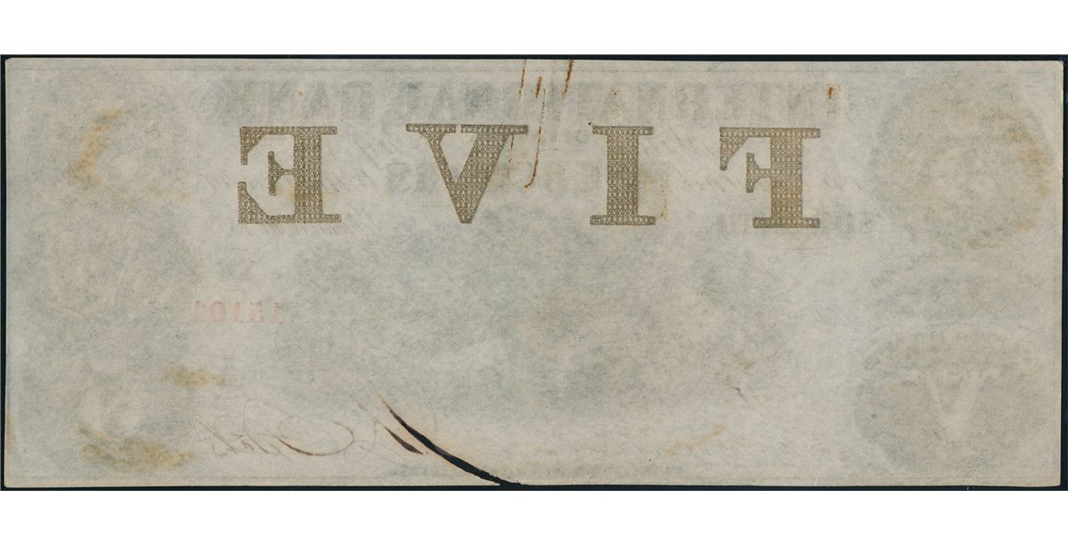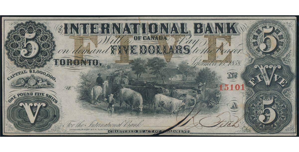 THE INTERNATIONAL BANK OF CANADA. $5.00. Sept. 15, 1858. CH-380-10-08-16. Brown Protector. Red Serial number 15101/A. Signed J.R. Fitch. AU. Ink through paper at signature.