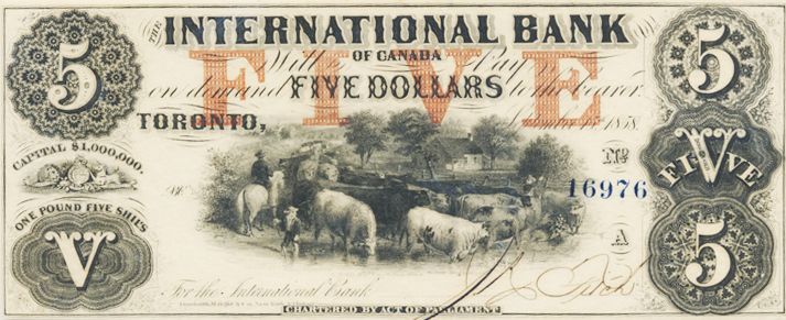 THE INTERNATIONAL BANK OF CANADA. $5.00. Sept. 15, 1858. CH-380-10-10-16a. Signed J.R. Fitch. Red ‘word’ protector. Large blue serial No. 16976/A. AU.