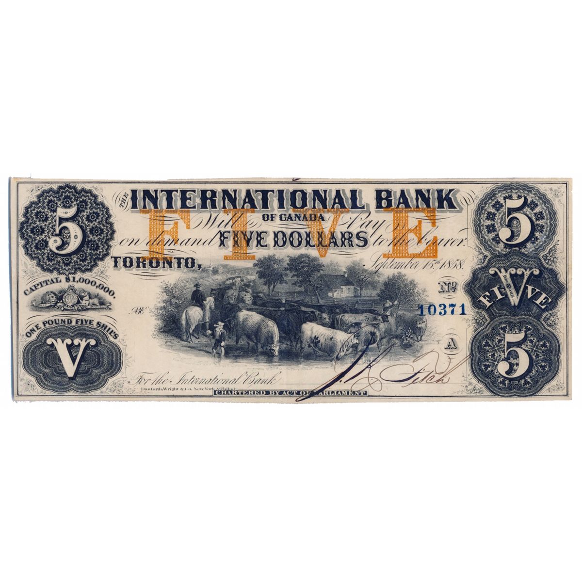 THE INTERNATIONAL BANK OF CANADA. $5.00. Sept. 15, 1858. CH-380-10-12-16a. Signed J.R. Fitch. Ochre ‘word’ Protector. Small Blue Serial number 10371/A. Extra Fine.