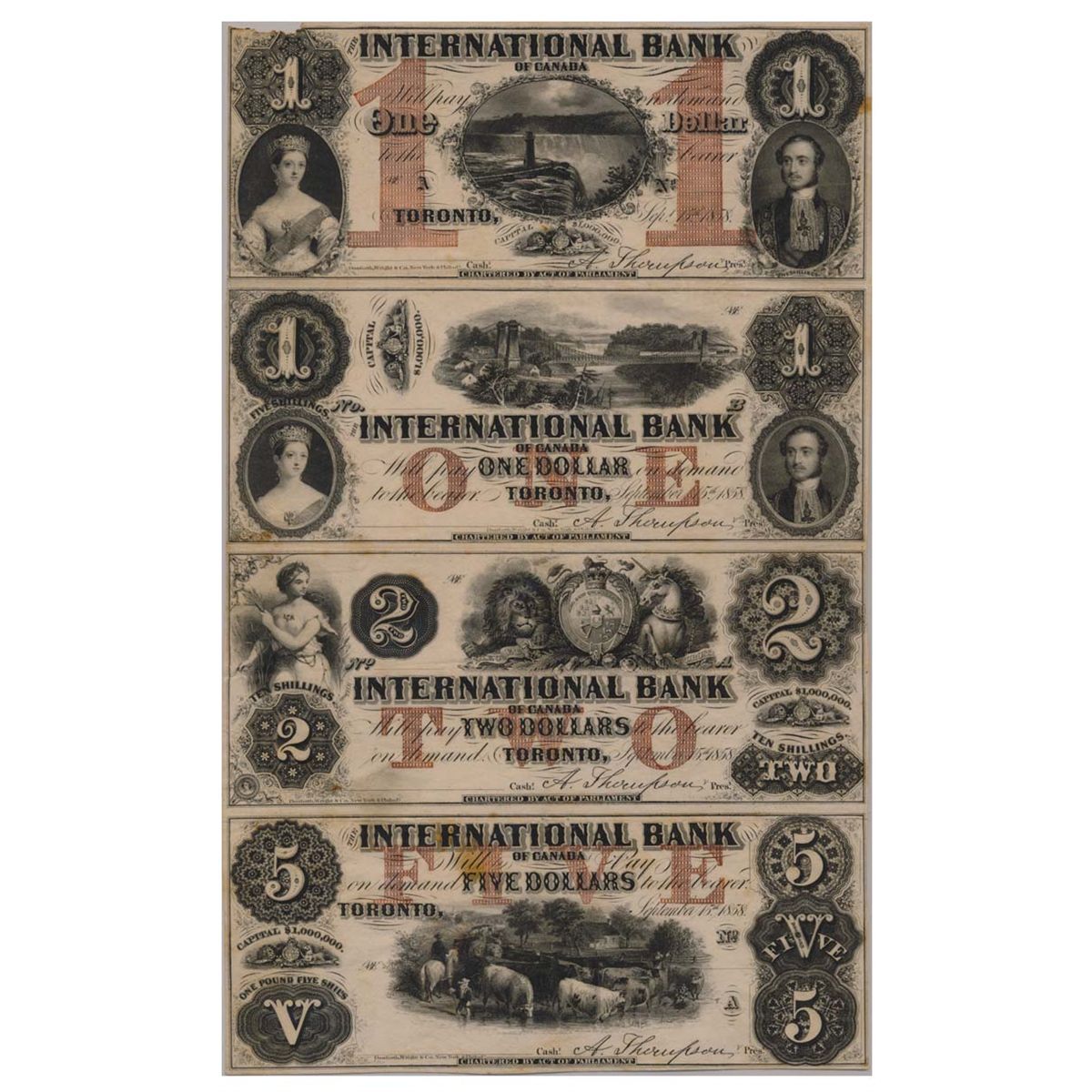 THE INTERNATIONAL BANK OF CANADA. A FULL SHEET. $1.00, $1.00, $2.00, $5.00. Sept. 15, 1858. CH-380-10-04-02R, 04R, 06R, 08R. Signed A. Thompson at right signature areas. Red ‘numeral’ or ‘word’ Protectors. No Serial numbers. A Unique Remainder sheet and believed to be the only known full sheet of any issue from the International Bank of Canada.