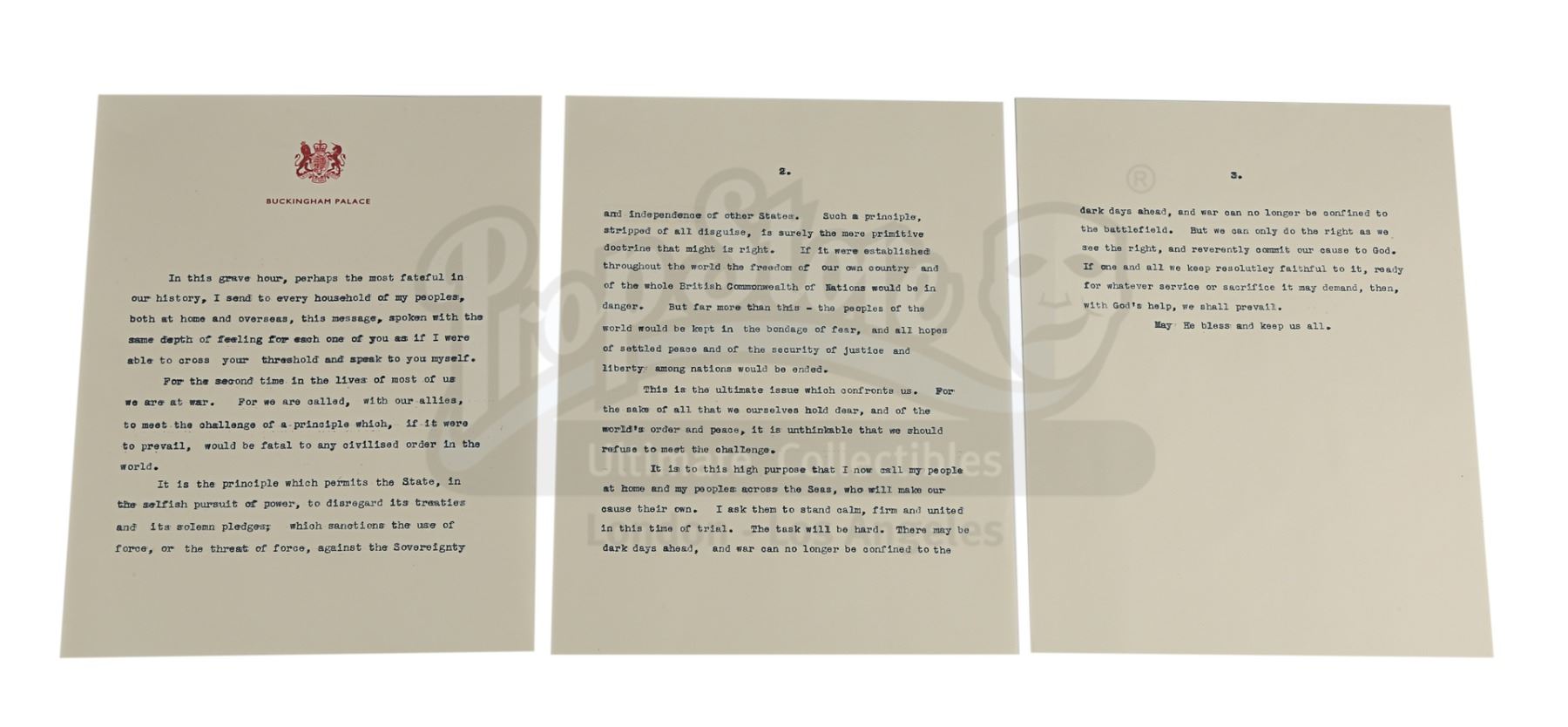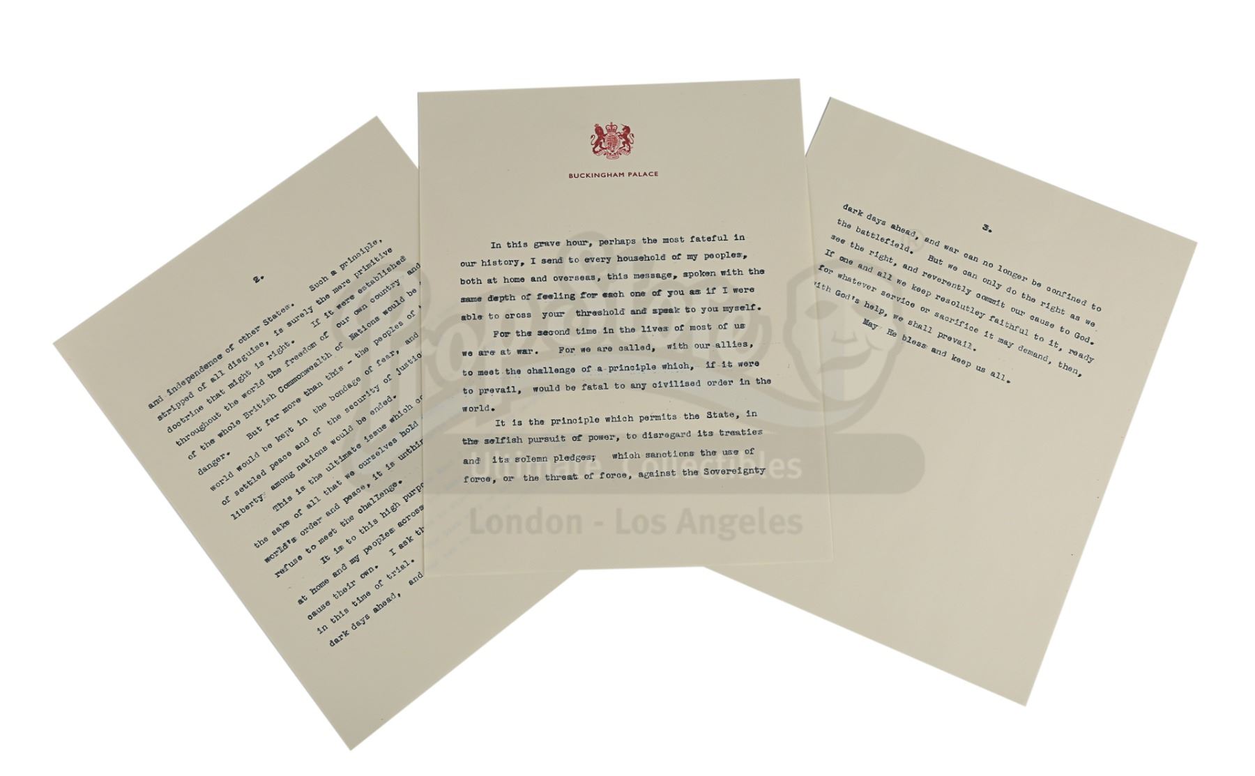 The lot consists of three pages of off-white paper, bearing printed text which mimics that of a typewriter. The first page features the royal coat of arms and "Buckingham Palace" printed in red. There is only very minor wear to the sheets. Dimensions (each page): 24.5 cm x 19.5 cm (9 3/4" x 7 3/4")