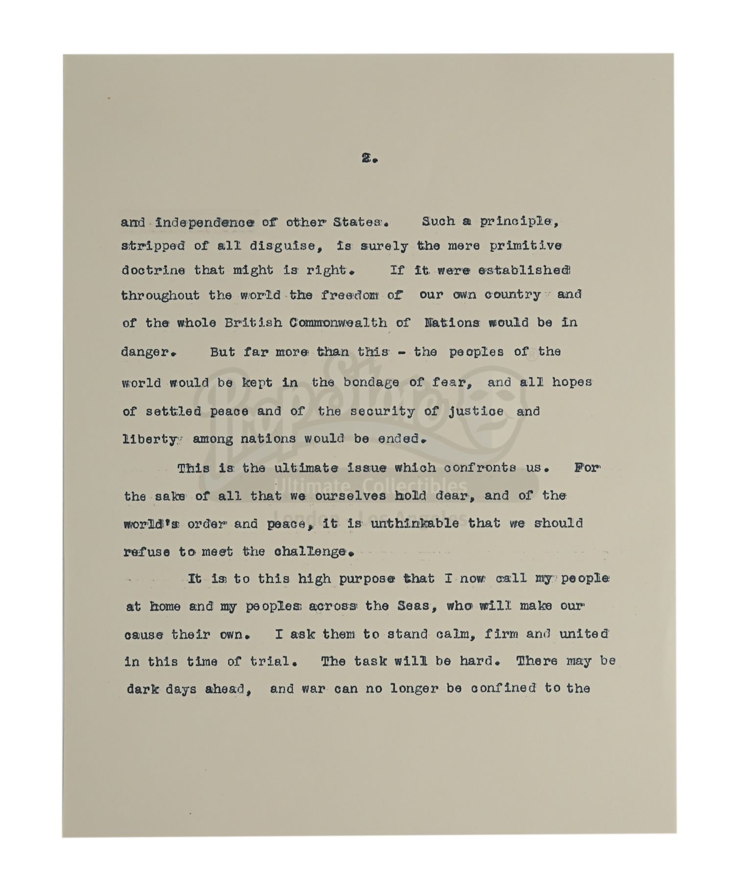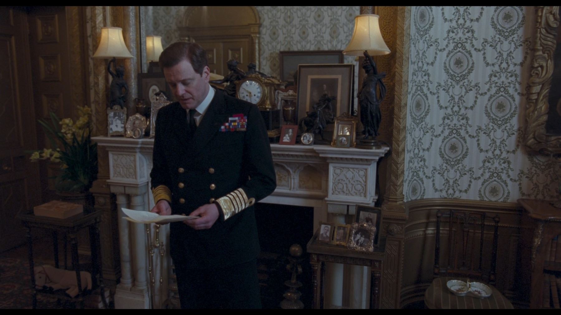 King George VI's (Colin Firth) speech from Tom Hooper's historical drama The King's Speech. King George performed his speech at the climax of the film, as he announced Britain's declaration of war against Nazi Germany. Lionel Logue (Geoffrey Rush) was also given a copy of the speech.