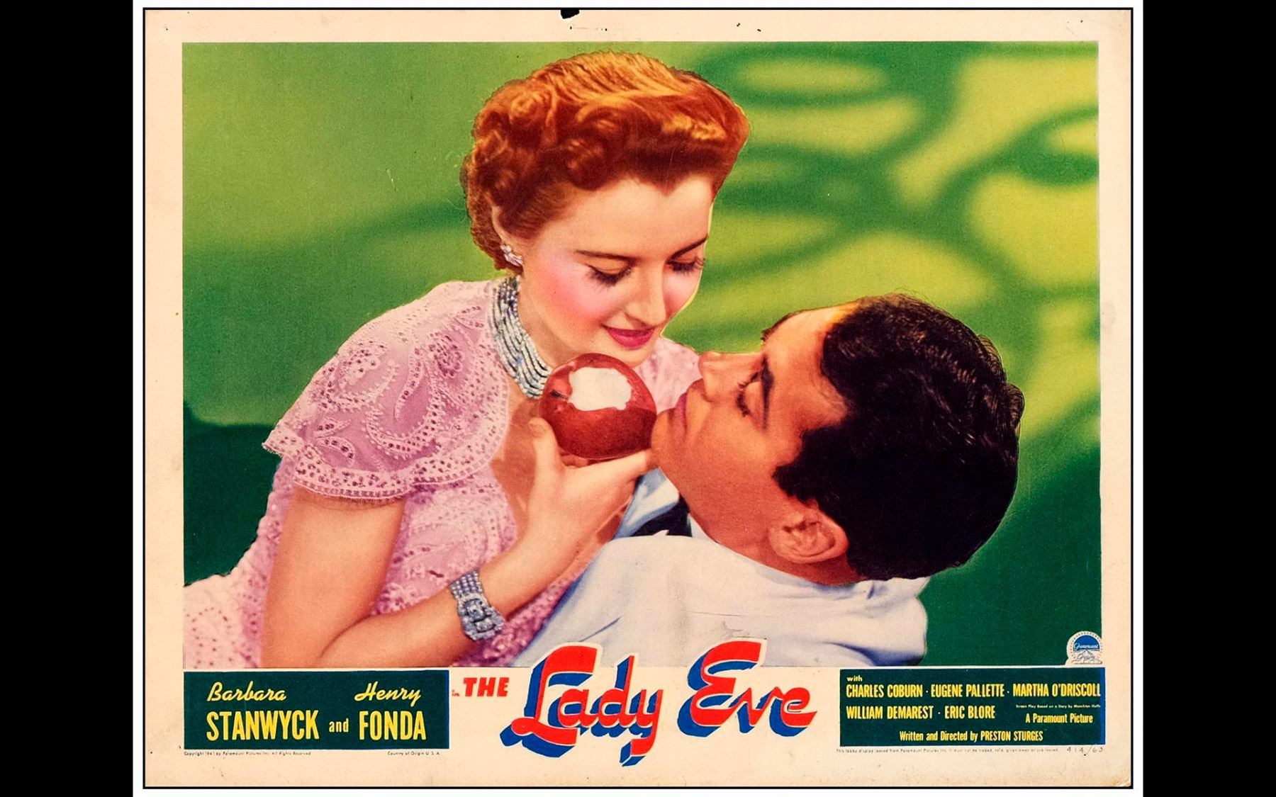 This beautiful card from director Preston Sturges' classic comedy is unrestored and exhibits pinholes, smudges, a small chip and a tiny tear in the borders, light unobtrusive scuffs in Stanwyck's hair and a small background scratch. The beautiful color tints and greed background compliment the attractiveness of the image.