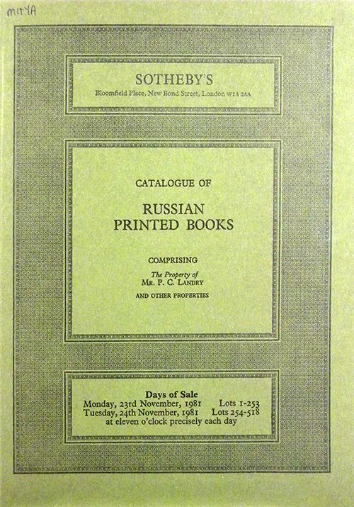 Sotheby's. CATALOGUE OF RUSSIAN PRINTED BOOKS, COMPRISING THE PROPERTY OF MR. P.C. LANDRY AND OTHER PROPERTIES. London, Nov. 23-24, 1981. 8vo, original printed card covers. 69, (3) pages; 518 lots; 7 plates. Prices realized list with buyers' names. Fine. A very important sale of rare Russian numismatic (and other) books.