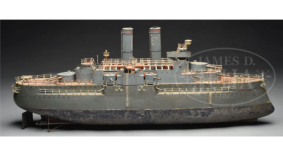 Massive in size, it is difficult to comprehend that a toy like this was ever created for a child, more likely an adult male who had dashed dreams of becoming a sea captain or naval commander. One can only imagine the cost of a toy like this back in the earlier part of the 20th century! Obviously a toy of this nature would not have been easy for a youth to handle as it is both heavy and elaborate. Typical of Marklin of the period (1910-1915), their craftsmen have reproduced in toy form a realistic copy of battleships of the time. This toy has been buried away for decades and has recently come to the market as a fresh find and never having been in a collector's hands prior to this. A plethora of turrets with guns in various sizes littered the deck as well as walkways above the superstructure. Two massive stacks protrude well above the deck line, and one can only imagine the impressive nature this boat would exude while in the water. Most likely the boat was powered by a clockwork mechanism (mechanism no longer present), which would have been attached to the two propellers. The upper deck lifts off to expose the interior of the hull. Not only did this boat have numerous cannons, but there are a number of lifeboats as well, which unfortunately are missing. A fair amount of original paint still remains with heavier paint loss to the tangerine deck and dark blue water line/hull. "HMS Russell" is emblazoned on the left and right side of bow. This boat has in excess of 40 clips on her deck under which one could insert sailors. Overall the boat needs some cosmetic attention and replacing missing parts, but when completed, this toy would be a spectacular showpiece central to any collection. The HMS Russell was commissioned in February 1903, having taken four years to build. She was a Duncan-class pre-Dreadnaught of the Royal Navy and saw service in the Mediterranean. She met her fate when she was sunk by two mines laid by a German U-Boat off the coast of Malta on April 27, 1916. SIZE: 46" l. CONDITION: Overall fair to good. 1-12829