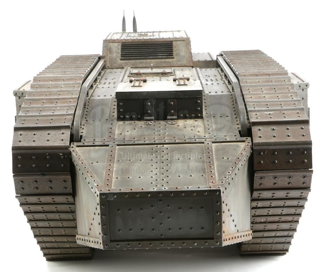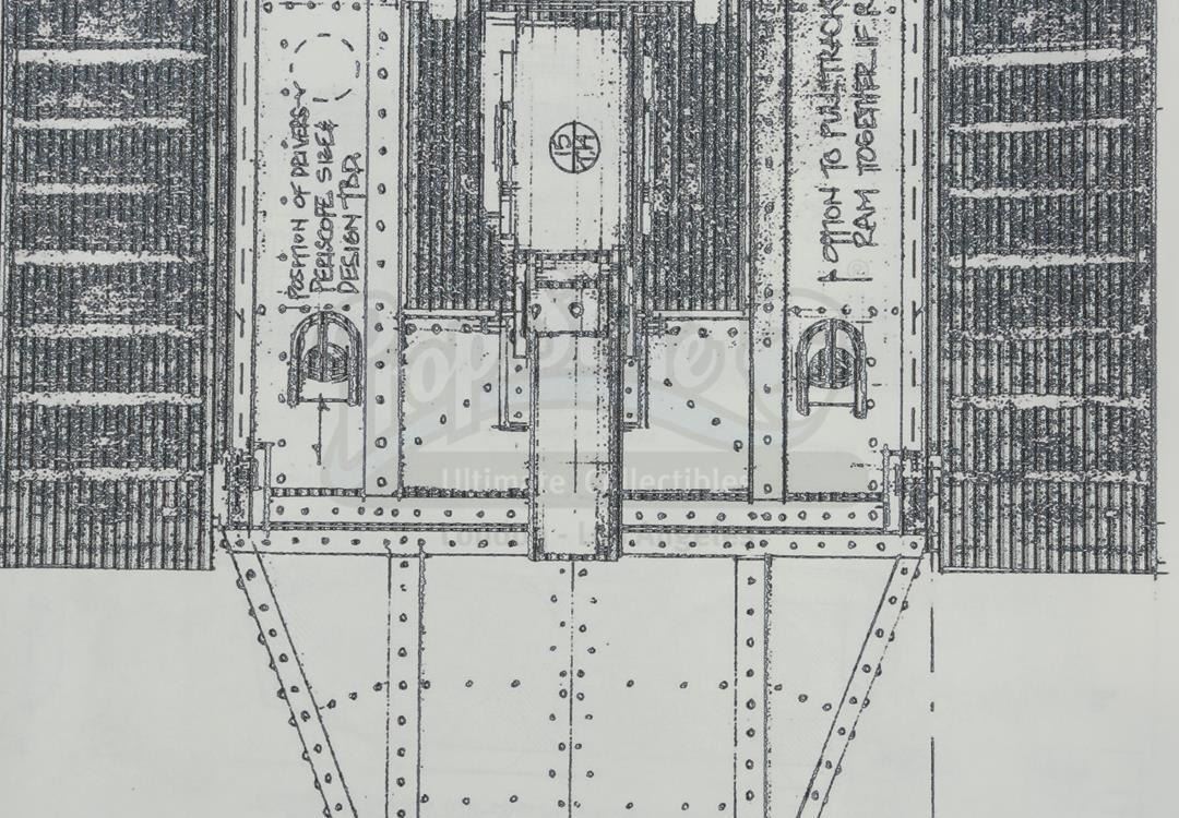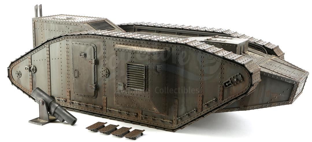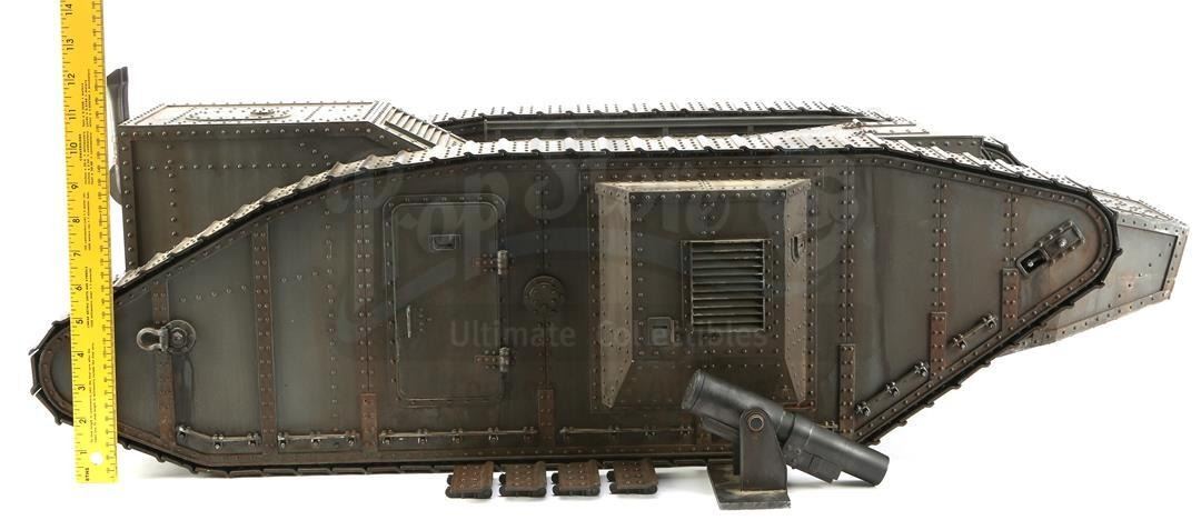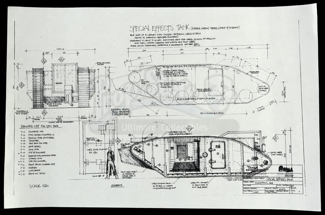 This lot consists of an ornately detailed resin and metal tank model miniature painted brown, green, and black to match the onscreen vehicle's steampunk aesthetic, as well as four loose metallic armour plates, an additional movable cannon, and 13 printed black-and-white blueprints and design sketches printed with the production logo. One blueprint is labeled "Special Effects Tank" and dated "2002". The lot is in good overall condition with minor discolouration to the tank from age and minor edge wear to the prints. Dimensions (largest): 94 cm x 39.5 cm x 31.75 cm (37" x 15 1/2" x 12 1/2"); (smallest): 4 cm x 4 cm x 1.25 cm (1 1/2" x 1 1/2" x 1/2")