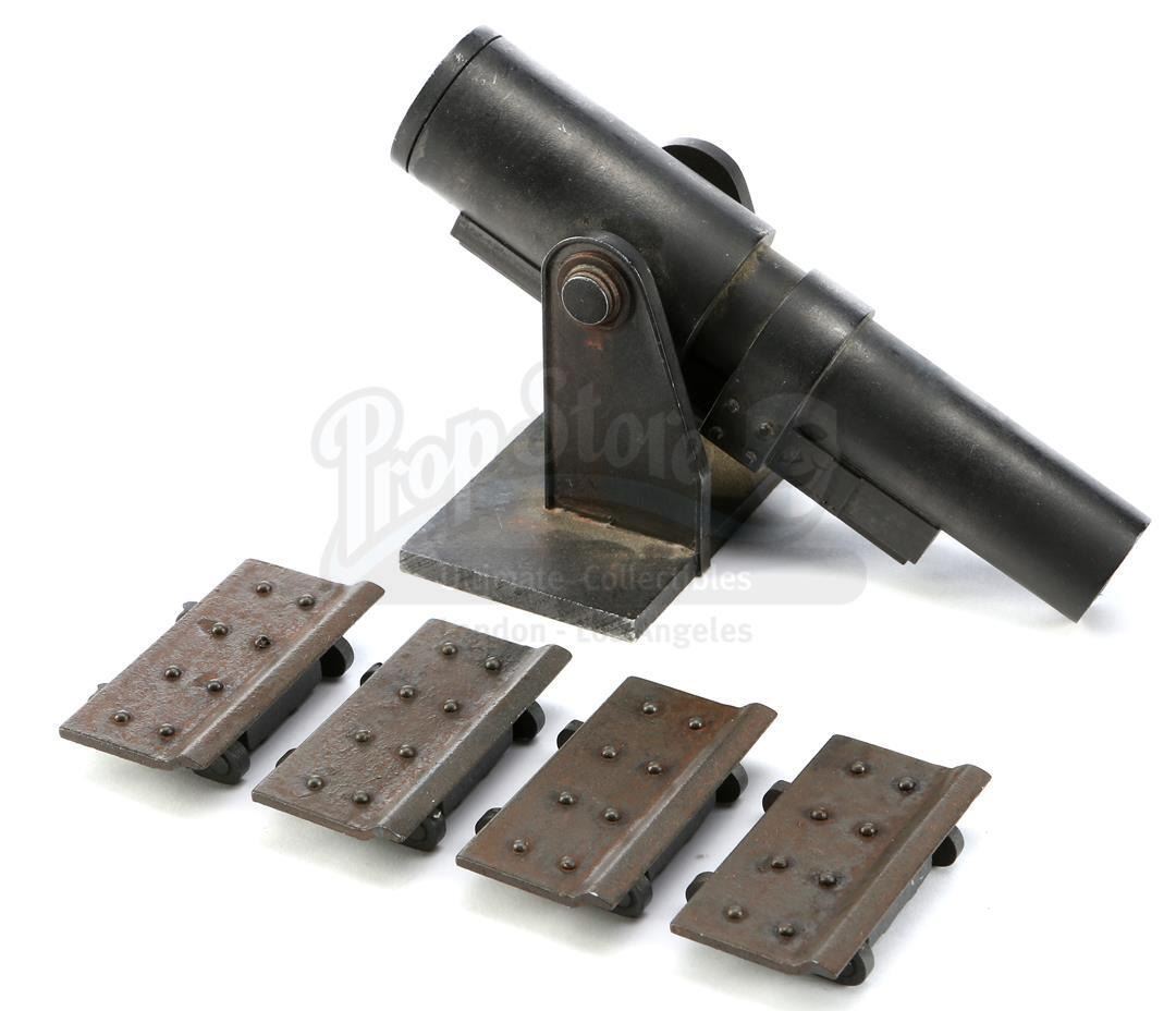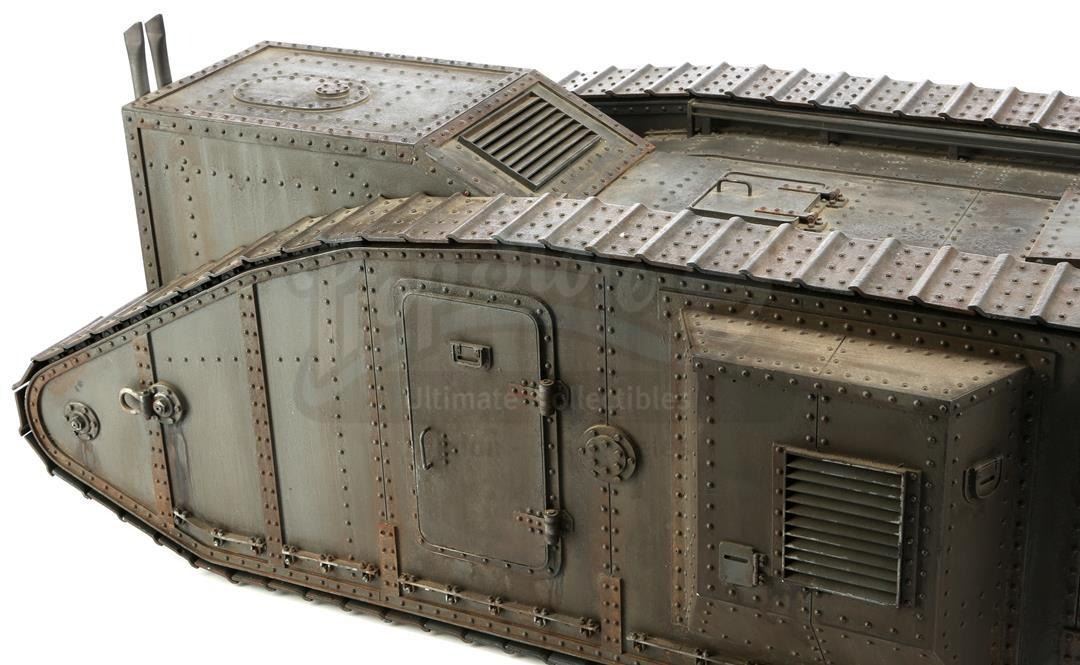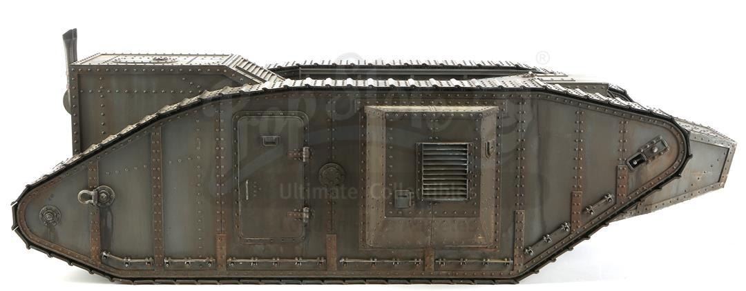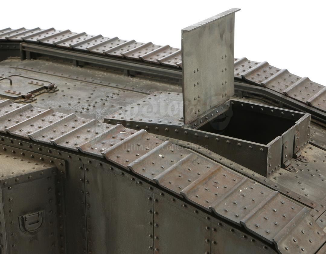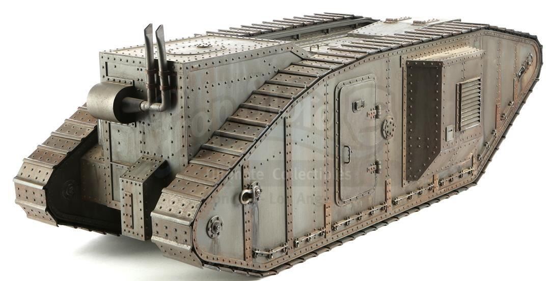This lot consists of an ornately detailed resin and metal tank model miniature painted brown, green, and black to match the onscreen vehicle's steampunk aesthetic, as well as four loose metallic armour plates, an additional movable cannon, and 13 printed black-and-white blueprints and design sketches printed with the production logo. One blueprint is labeled "Special Effects Tank" and dated "2002". The lot is in good overall condition with minor discolouration to the tank from age and minor edge wear to the prints. Dimensions (largest): 94 cm x 39.5 cm x 31.75 cm (37" x 15 1/2" x 12 1/2"); (smallest): 4 cm x 4 cm x 1.25 cm (1 1/2" x 1 1/2" x 1/2")
