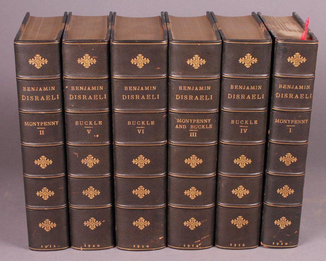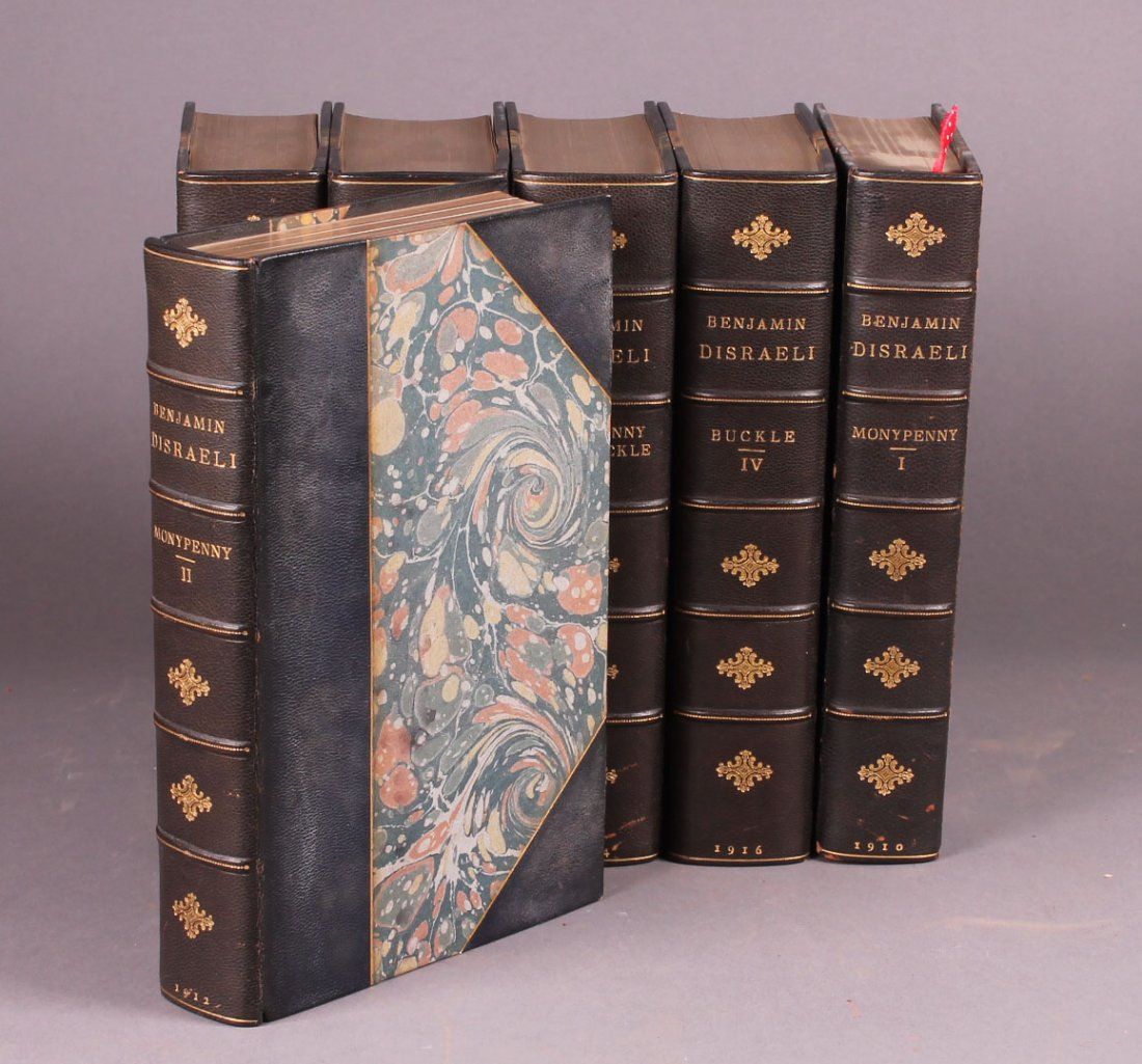 [Benjamin Disraeli]. Willam Flavelle Monypenny. THE LIFE OF BENJAMIN DISRAELI Earl of Beaconsfield. 6 Vols. Lon: John Murray, 1910-1920. Thick 8vo. Half navy blue morocco and marbled board by Bartlett & Co., Boston. Teg. Numerous plates (mostly ports).