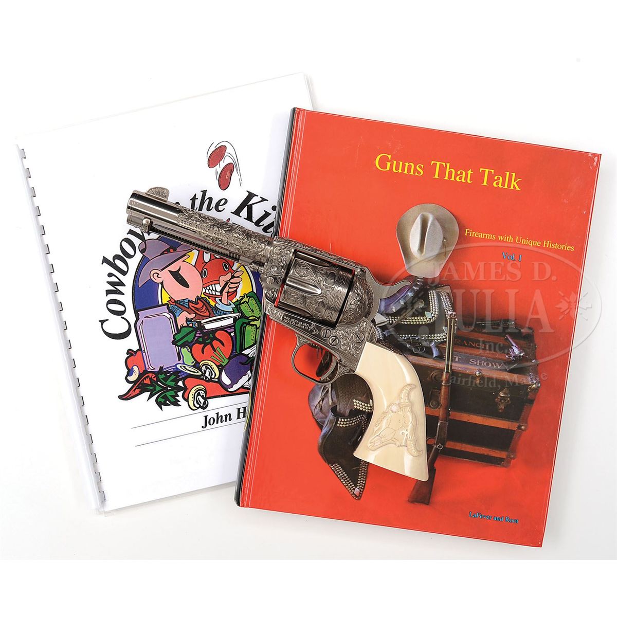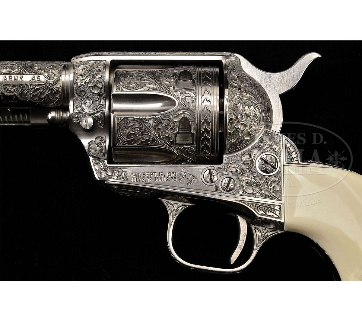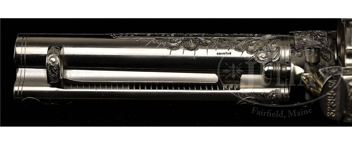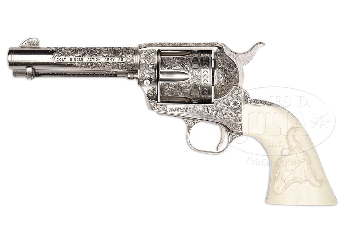 SN 32395SA. Cal. 45 Colt. Nickle finish with 4-3/4" bbl, full front sight, 1-line block letter address with model and caliber marking on left side. Left side of frame has 2-line three patent dates and the Rampant Colt. Bottom of the bbl is stamped in tiny letters "SHOSTLE". Mounted with orig 1-piece ivory grip with raised buffalo skull motif on left side. Inside each ivory slab has the SN in pencil along with "TD '83". Left side of the front and back straps, under the grip, is marked with the SN. Revolver has nearly full coverage, very deep relief engraving in leaf and vine patterns. Ejector housing, backstrap, buttstrap, and trigger guard are engraved to match. Both sides of the front sight are engraved. Cylinder has matching engraving with a feather border pattern around the rear edge which is also found in the top gullet of the ejector housing. This revolver is pictured on page 251, as well as on the cover and identified by serial number, in the book Guns That Talk, LaFever & Root, in a grouping of 5 single action colts, captioned "A few of the Colt Single Actions owned and used by John Hart, the Lone Ranger". Inside the cover is the inscription to Herb Wilmers over the signature of Nick LaFever, the author. This inscribed copy of this book accompanies. Also accompanied by a cook book by John Hart with an autographed color picture of Mr. Hart kneeling by his star on the Hollywood walk of fame. Also included in the lot is a fabulous black and white photo of John Hart signed and inscribed to our consignor and also identifies the gun by serial number. John Hart was born December 13, 1917 and died December 20, 2009. He grew up in California and as a youngster worked as a cowboy on two different California cattle ranches. He was mostly a western movie actor but appeared in a variety of films beginning in 1937. He was drafted into the Army in WWII and rose to the rank of 1st Sgt and served in the Philippines. After the war he returned to acting and in 1953 replaced Clayton Moore as the Lone Ranger for one year in the T.V. series by the same name. He also continued acting in supporting roles in various movies and in 1957 portrayed "Hawkeye" in the syndicated western series Hawkeye and The Last of The Mohicans. He also continued to appear in various T.V. shows. Accompanied by a fine glass topped, burgundy velvet lined Colt custom shop showcase. CONDITION: Appears to be new and unfired retaining virtually all of its custom finish after engraving. Grip has a few age lines and retains a light ivory patina. Case is equally new. 4-48384